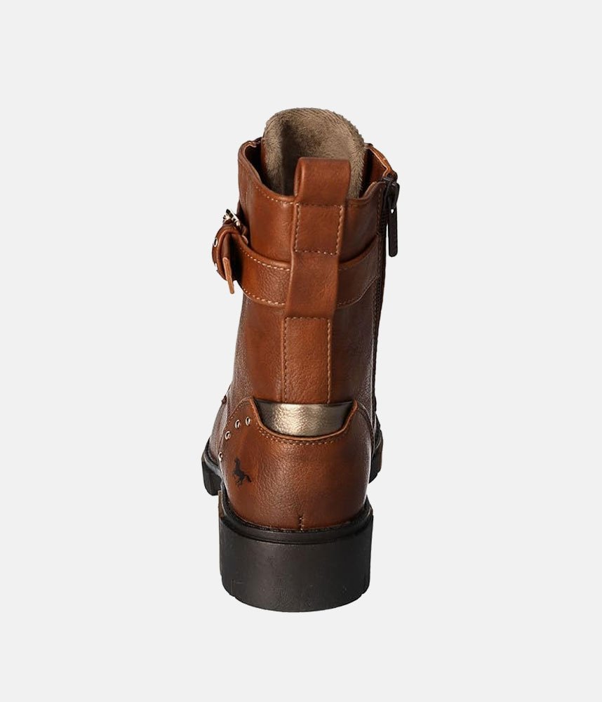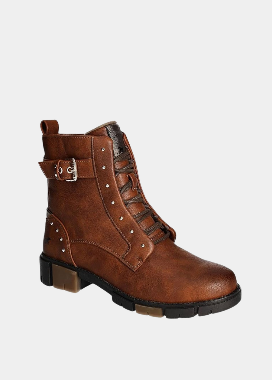 This is a versatile and stylish boot from Mustang with decorative lacing and functional side zip. Featuring buckle and studded detailing on the upper; Perfect to pair with your favourite Jeans, or dresses and skirts.