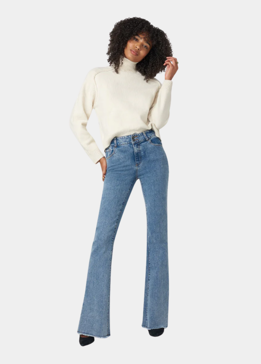 Our Olivia Flare Jeans are a chic embodiment of classic style mixed with a modern twist, boasting a classic 5-pocket design and eye-catching side slits on both legs. The flare silhouette adds a touch of drama, perfect for a polished look with pumps or casual flair with ankle boots.