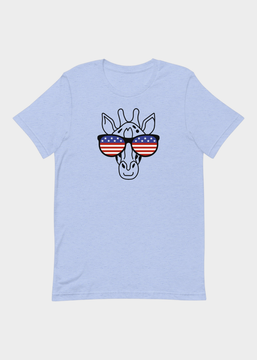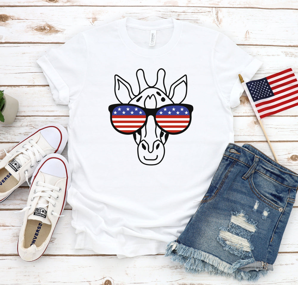 Show off your patriotic spirit in this funny, tall-inspired t-shirt that boasts a picture of a giraffe's face wearing a pair of star-spangled glasses. It's the perfect attention-grabbing tee for any red, white, and blue celebration event!