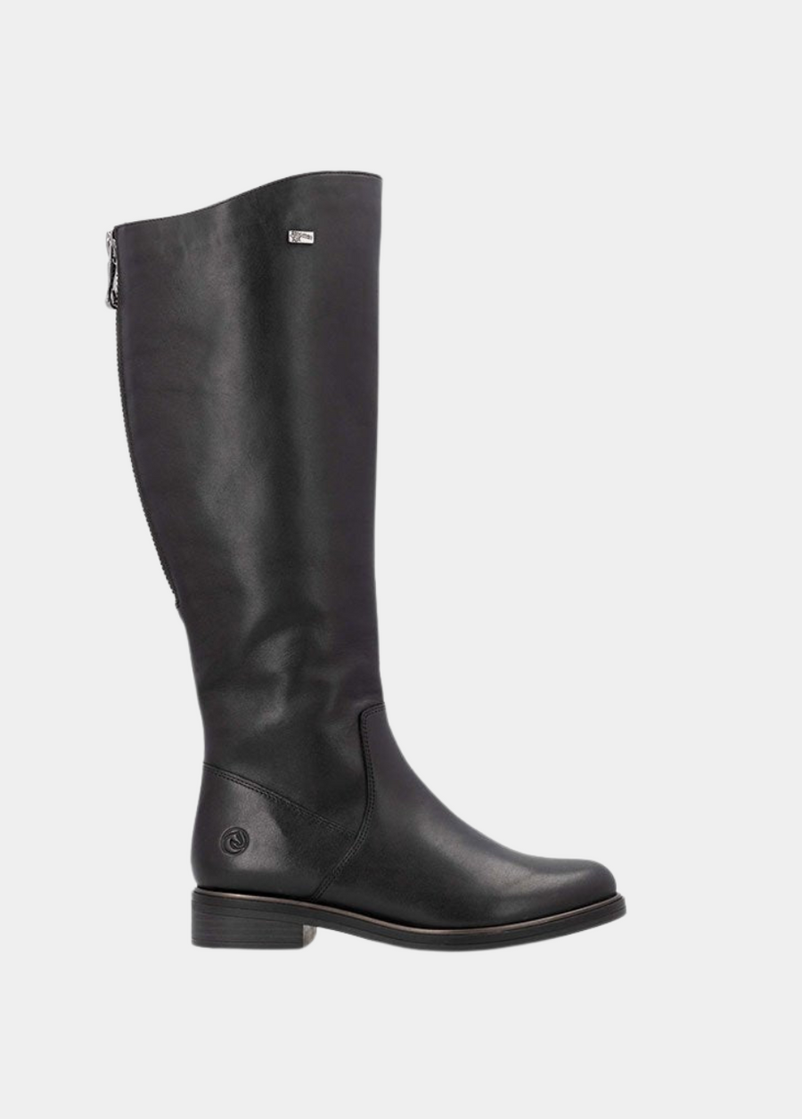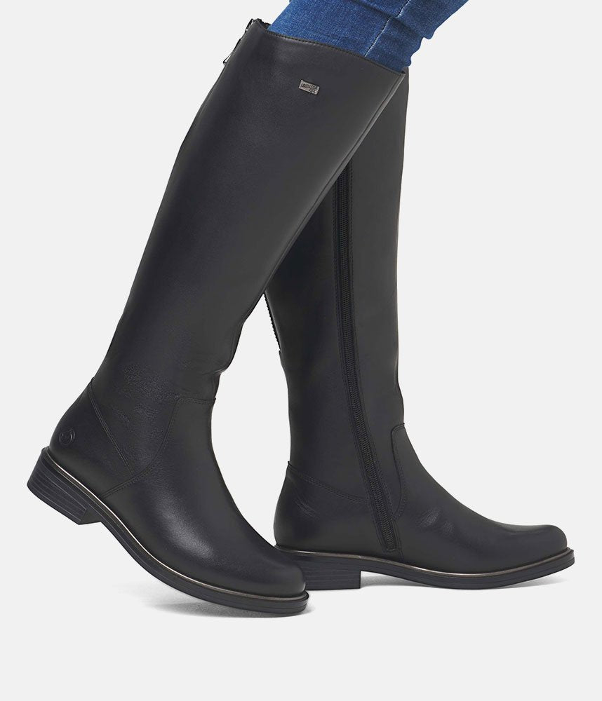 This is a Stylish Long Leather Boot from Remonte with a full-length side zipper. The zip at the back allows for adjustment in the width to suit your calf creating the perfect fit. In addition, the textile lining lends softness and warmth and the removable cushioned footbed absorbs shock and stress.