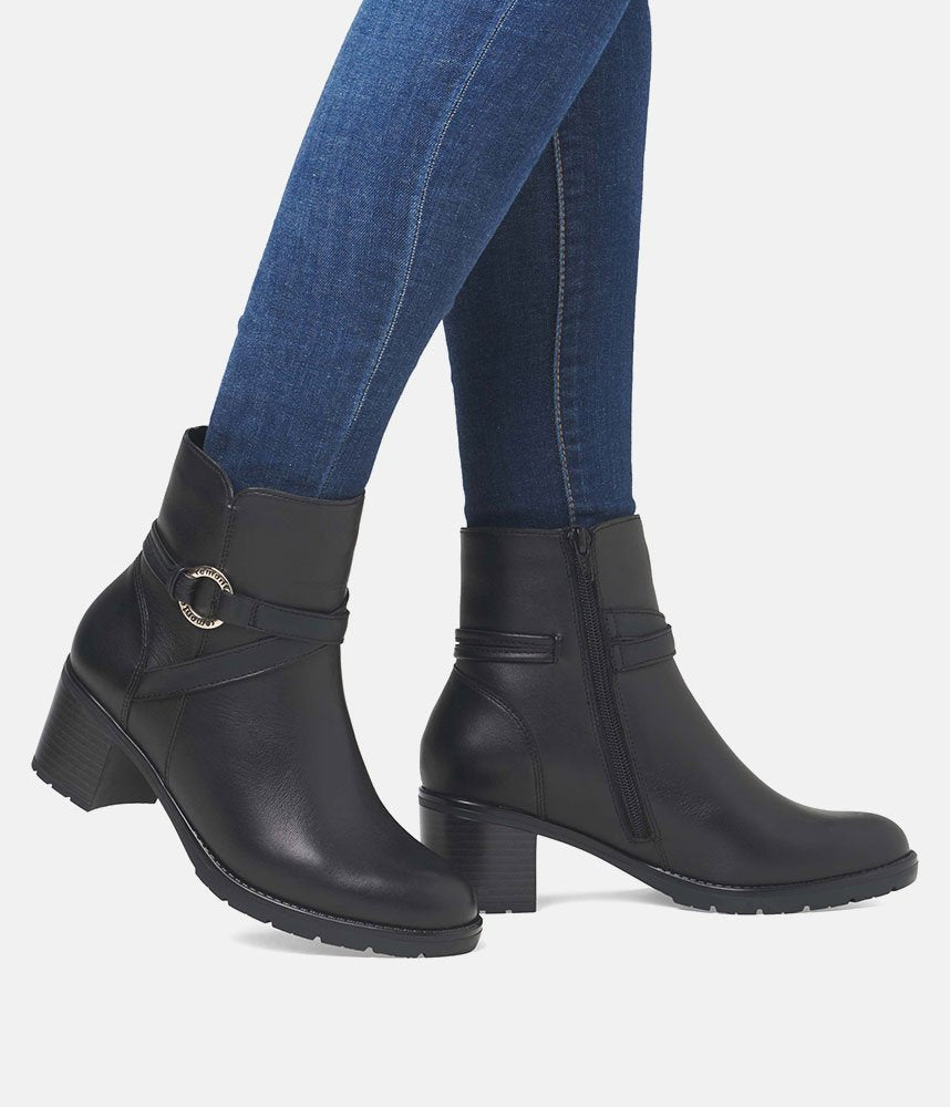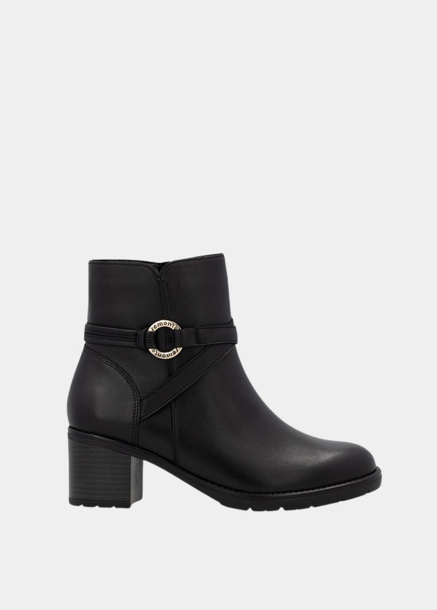 This is a Fabulous new style ankle boot from Remonte in classic Black leather. Both stylish and versatile, heeled ankle boots are the perfect partner for any of your autumn or winter looks! This Classic Black boot has an almond shaped toe, decroative buckle and rests on a block heel. Perfect for day to evening wear.