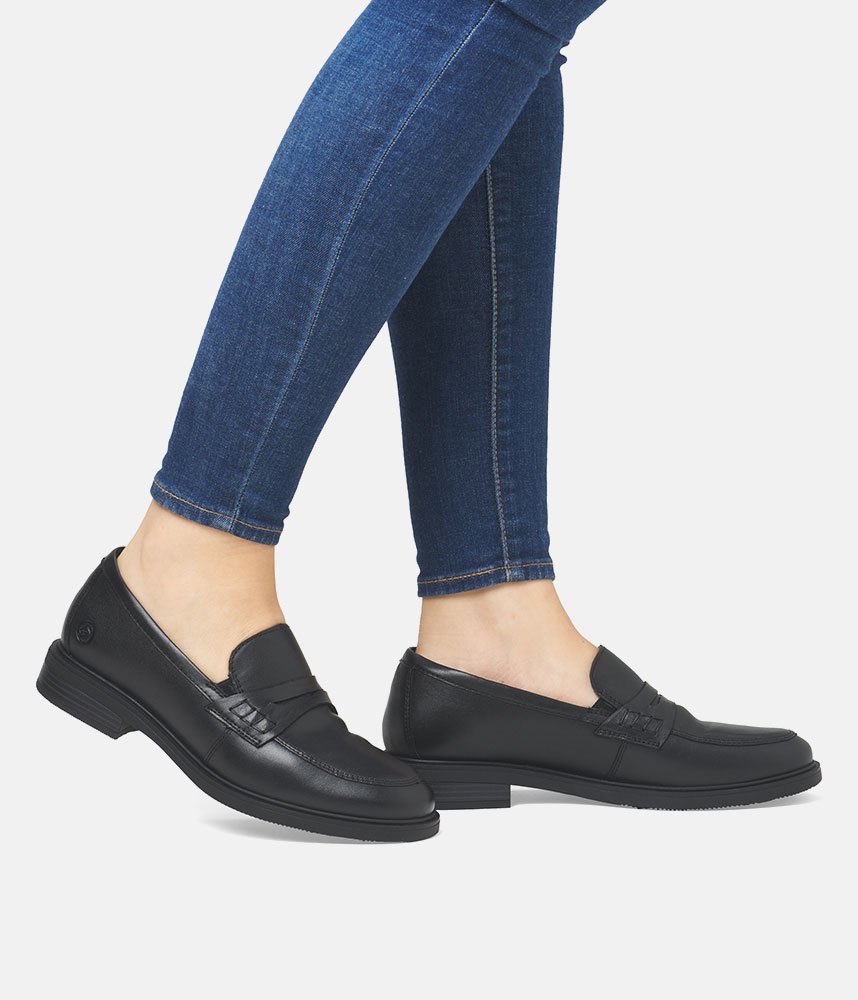 Penny loafers are a timeless and Iconic classic in women's footwear. This new model from Remonte come in black leather, making them a versatile addition to any wardrobe. These shoes are not only stylish, but also practical, with a sturdy rubber sole that provides excellent grip and durability. Whether you’re dressing up for work or going out for a casual weekend, these loafers are the perfect choice.