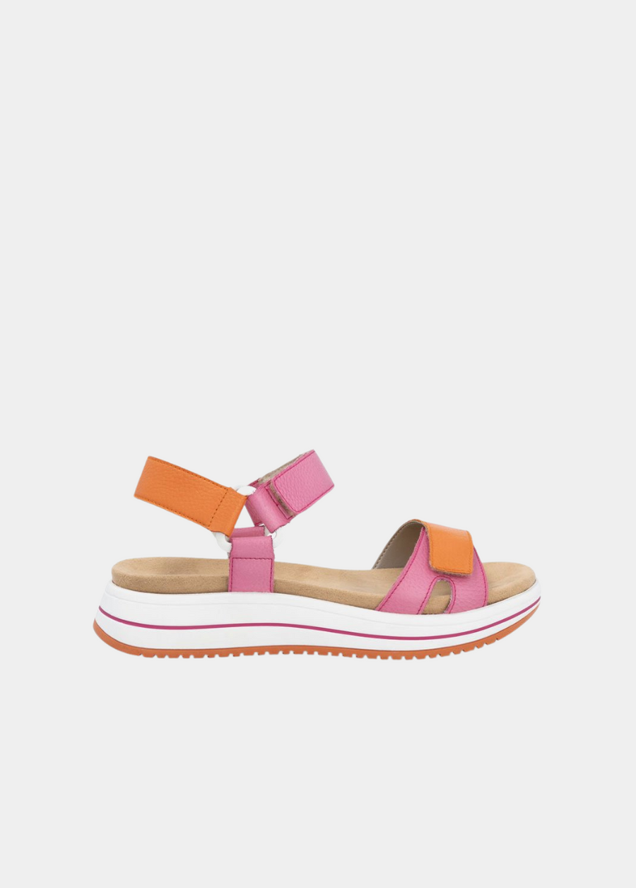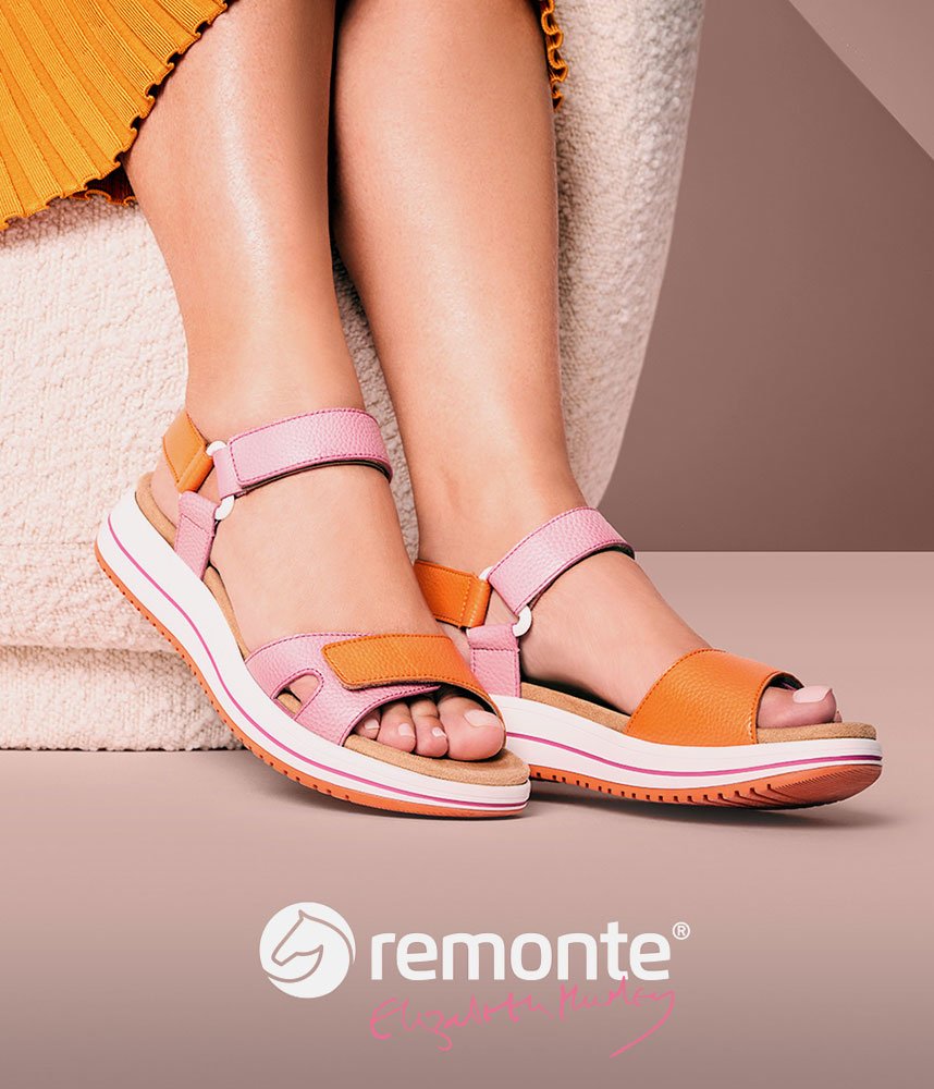 This is a Colorful new style from Remonte featuring Velcro straps in Pink and Orange and a contrasting white outsole. Featuring a shock absorbing insole which is light and flexible. They are not just stylish, but practical for everyday use. Ideal to pack for a vacation to pair with just about any outfit from shorts to long dresses and Jeans.