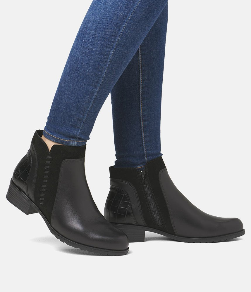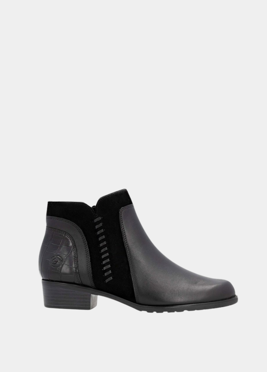 This is a great new style ankle boot from Remonte this season in classic Black leather with contrasting suede and textured paneling to complete this western-inspired look. With an inside zip for easy access and a soft textile lining.