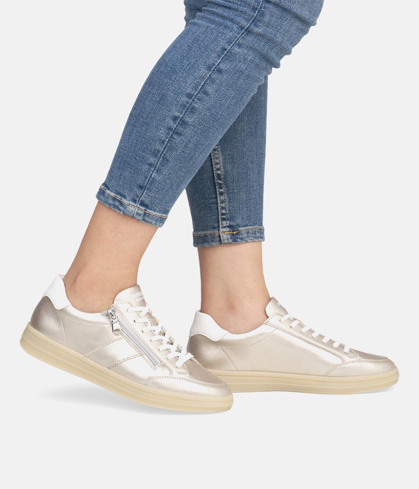 Introducing this New Style from Remonte; made in a beautiful combination of Gold with a white cuff and laces. Crafted with a leather upper and textile lining, these trainers offer exceptional comfort and style. A cushioned and removable soft insole provides optimal comfort and molds to the contours of your foot. The laces allow for an adjustable fit and the side zip makes it easy to slip on and off. This lightweight and stylish sneaker goes effortlessly with jeans and trousers for a versatile and fashionable look.