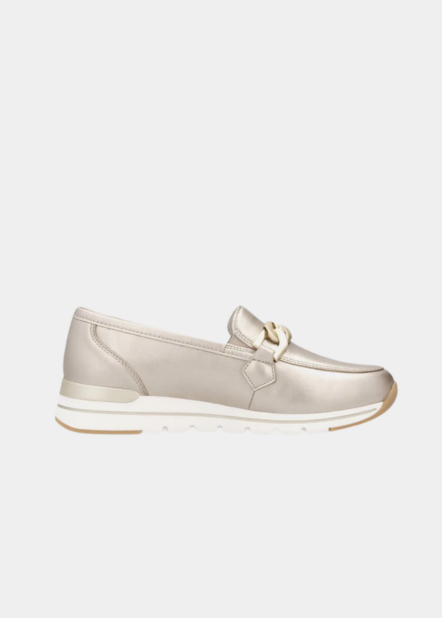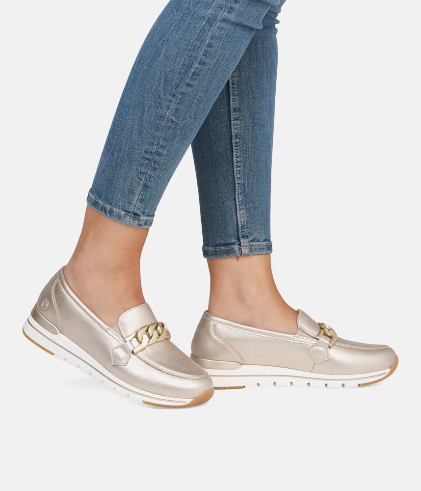 Elevate your style with this New Style from Remonte. These Gold Loafers have a sporty design with a chain detail to finish them off perfectly. Crafted from leather, these loafers offer fabulous comfort with a removable insole and extra-soft foot bed for a luxurious feel. The lightweight, slip-resistant sole provides stability.