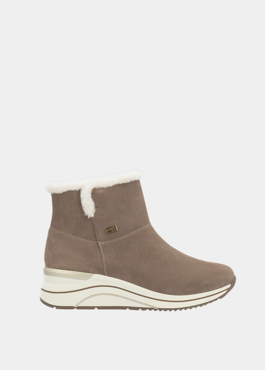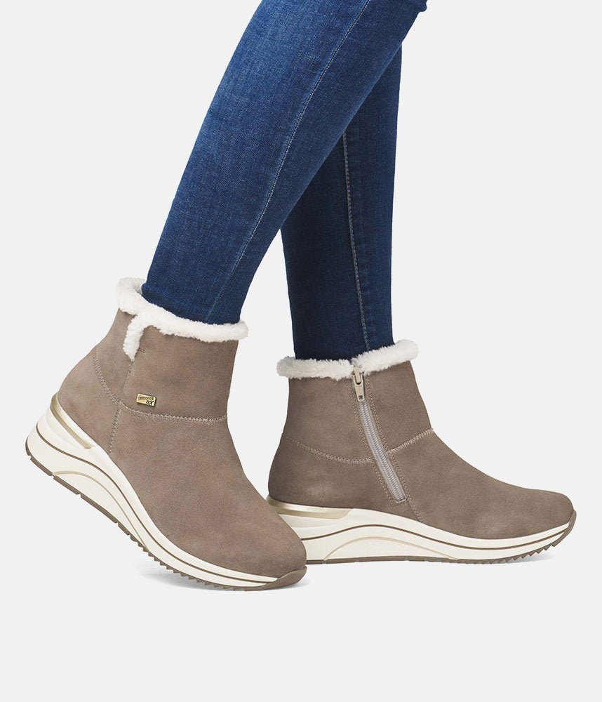 A Super comfortable and stylish ankle boot rocking that sock boot vibe with the feel of a trainer from Remonte. Featuring a combination upper in mix of black patent, suedette and a scuba like textile to the vamp and collar. The scuba textile collar has an elasticated fit which hugs the skin like a sock and is fastened by a zip down the middle. Finished with a wedge heel for added height without losing on comfort. Complete with a soft lining with a cushioned Remonte Soft removable insole.
