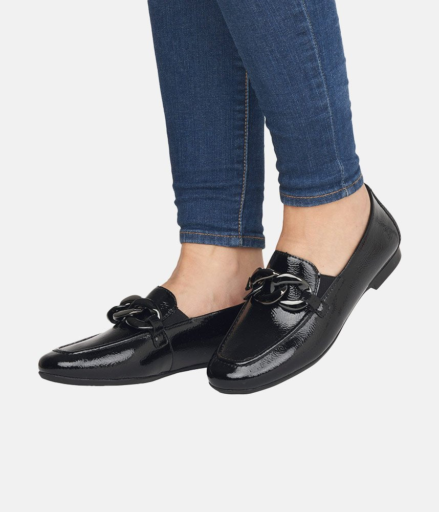 This is a Sophisticated new model from Remonte with a super stylish look, with a Patent leather upper, and chic link embellishment.