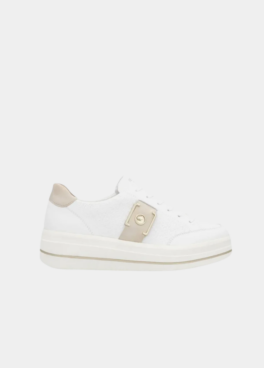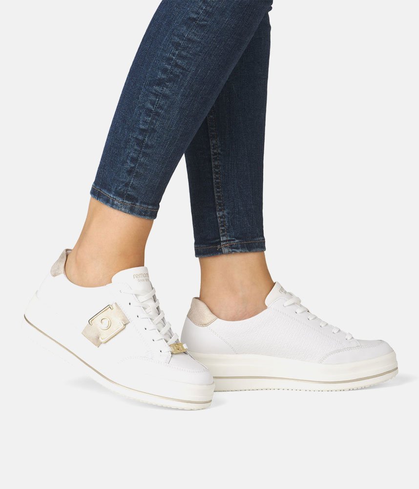 These white Remonte trainers are a great representative of fashionable elegance and comfort. With an impressive element on the side, a subtle print and gold decorations, they create a unique stylish look. You can create perfect comfort thanks to the lacing, and the soft removable insole provides comfort and adapts to the shape of the foot. These are the ideal choice if you’re looking for the perfect combination of distinctive design and comfort.