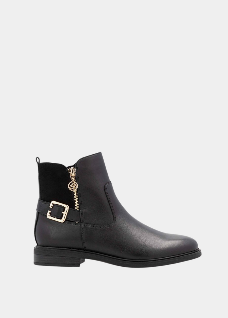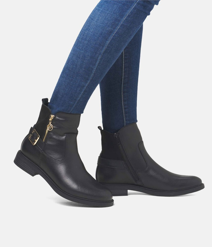 This is a great classic style ankle boot from Remonte in a classic black leather with contrasting brown on the cuff, decorative gold zip and buckle to complete the look. With a side zip for easy access and a soft textile lining.