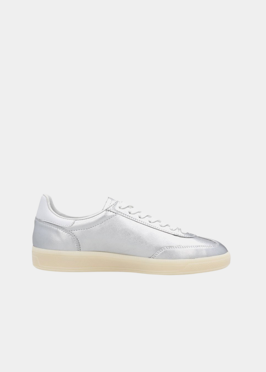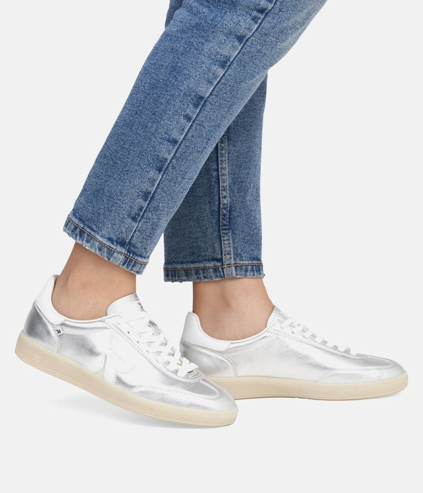 This is a Fabulous New Sporty low top Trainer from Rieker this season. Elevate your look and add these high quality Silver leather trainers to your wardrobe. Fastened with white laces this New style offers comfort with the Swing2GO insole with arch support that provides shock absorption and energy at each step .The lightweight, wear-resistant and durable outsole provides good traction and stability. These Silver Rieker low-top sneakers are made from high-quality leather.