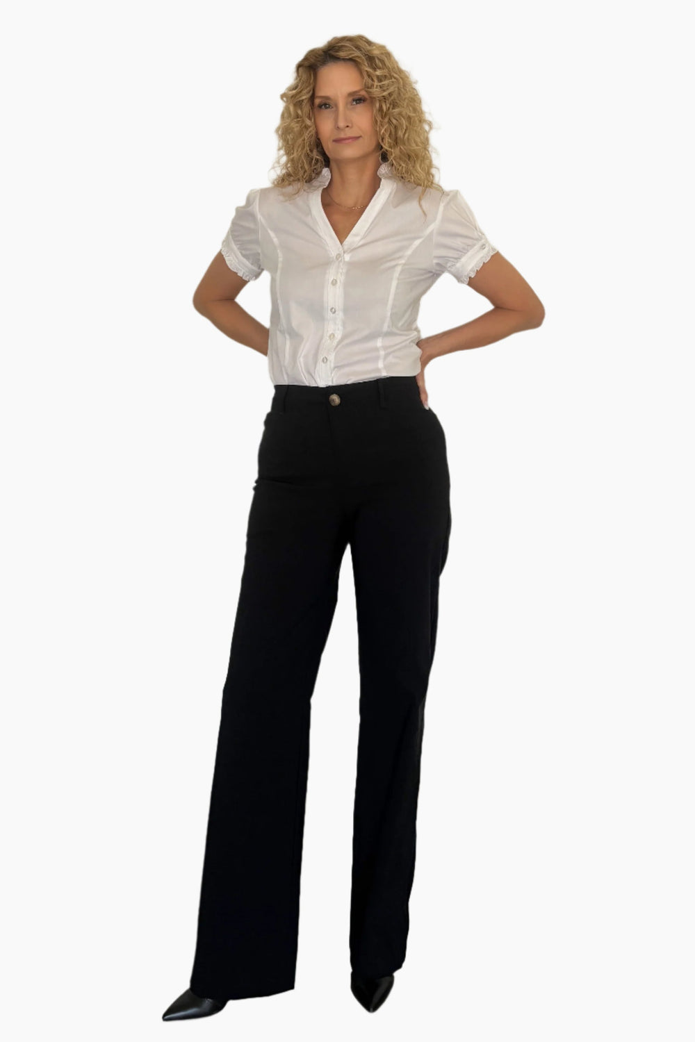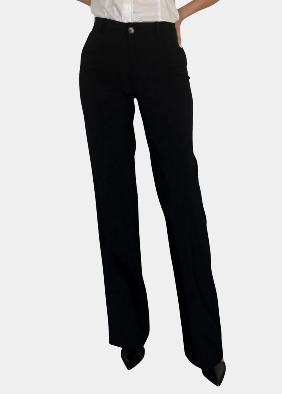 Sarah is the sister pant to our Emma pant - similar cut, but a new stretch twill fabric. The stretch twill fabric provides all day comfort while looking sleek and polished. Marbled button and zip style with a wide waist, belt loops, wide leg, no front pockets for a smooth look and functional back pockets.