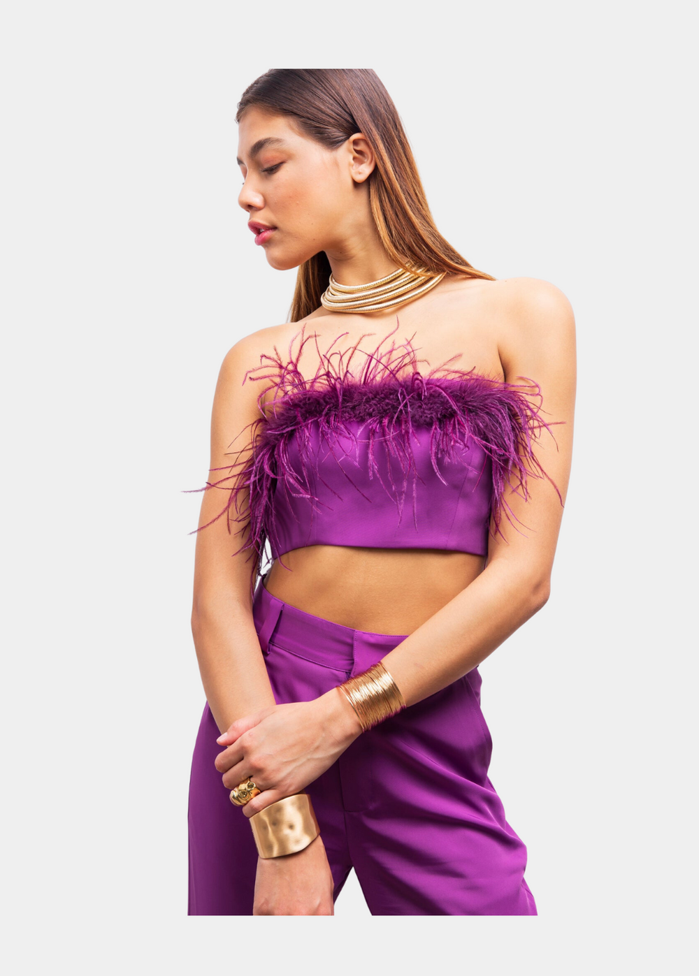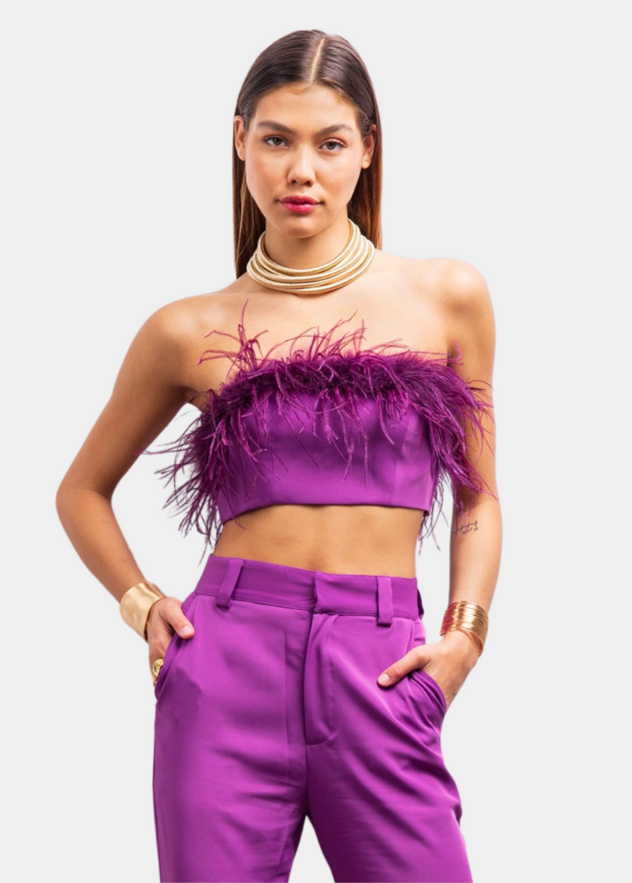 No accessories needed with this statement piece, she does all the work for you! The Ostrich Feather accent elevates the look, making it a must-have statement top for any outfit, match it with our Feel The Love pants for the full look.