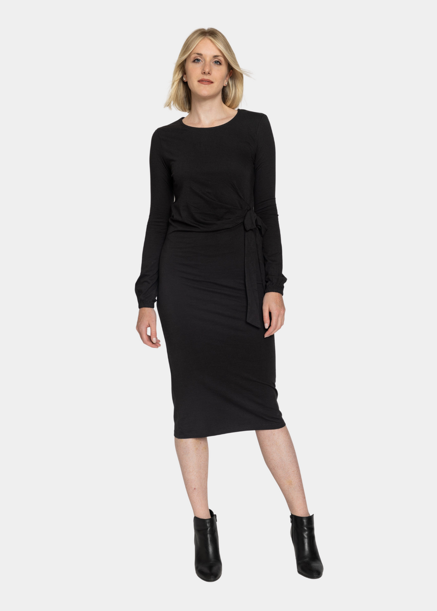 The Side Tie Long Sleeve Jersey Dress for Tall Women is designed to enhance the tall woman's silhouette with stylish, gathered side ties. This soft knit midi dress is a perfect blend of modern minimalism and effortless chic. The dress features a flattering round neck and long sleeves, offering a sleek and comfortable fit tailored specifically for tall women.