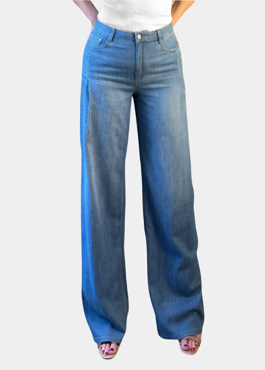 The perfect summer jeans is here! Made of a lightweight, stretch denim that is soft and flowy and not too heavy for warmer weather. 5-pocket styling with a zip and button closure. The front features offset drop pleats to give volume to the wide leg without adding any unwanted volume or bulk to the tummy area. Wide leg jeans are flattering on every body shape and are the perfect match for a tall girl's long legs!