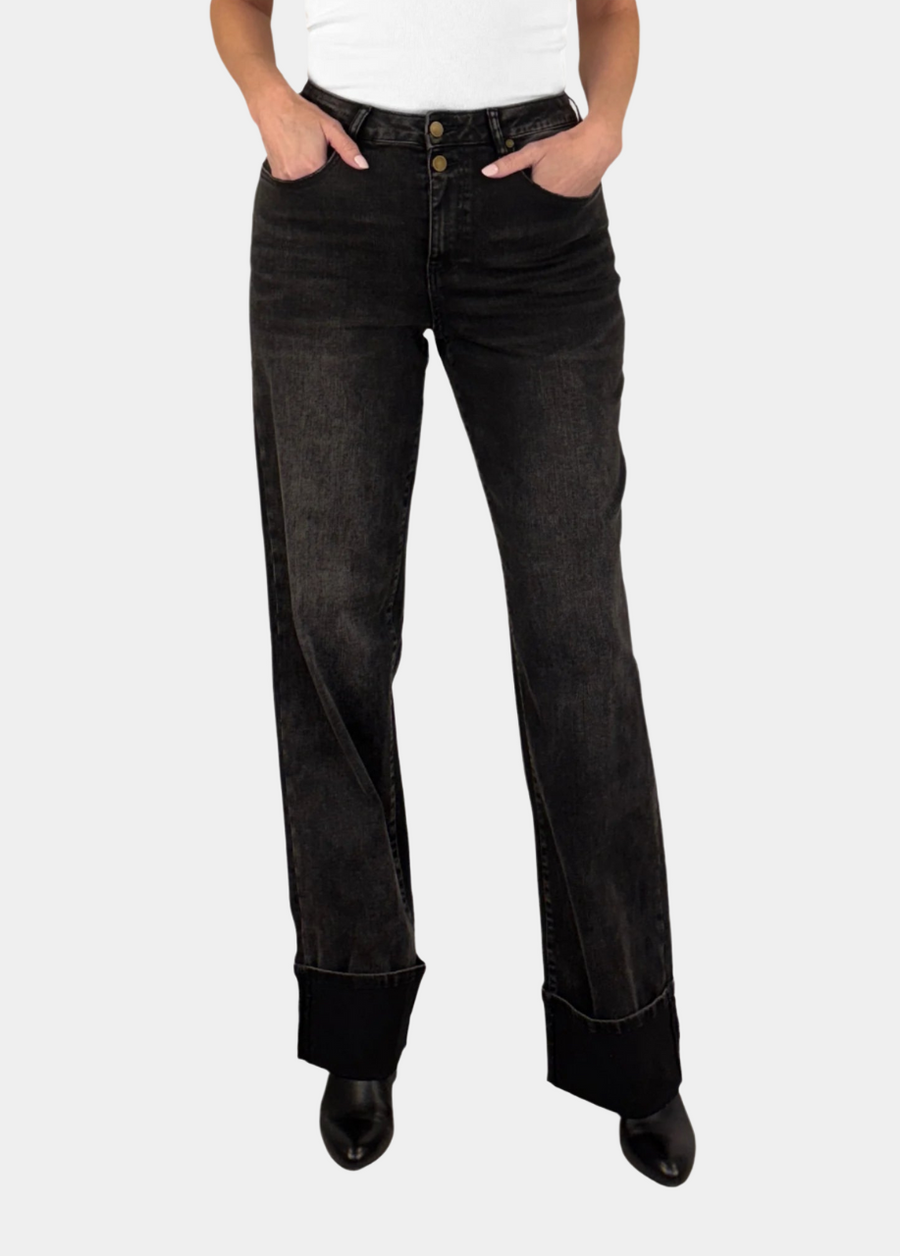 What tall girl doesn't love a cuff? This wide leg is right on trend. Wide, two button waistband, 5-pocket style, with wide cuff tacked in place. The girlfriend jean is a versatile update to a boyfriend jean with a looser, relaxed fit. Smoked Grey wash with light sanding and whiskers.
