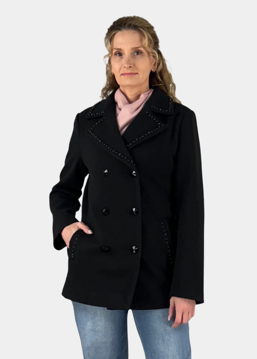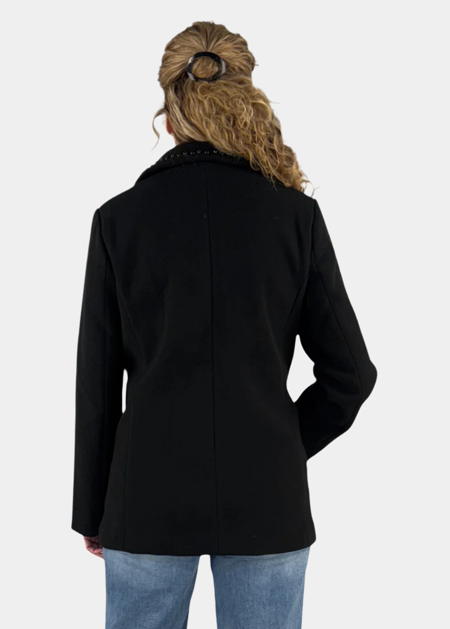 We've taken the classic peacoat and given her a modern twist. The fully lined, double breasted style features tonal, black on black embellished along the notched collar and welt pockets and topped off with dimensional buttons.