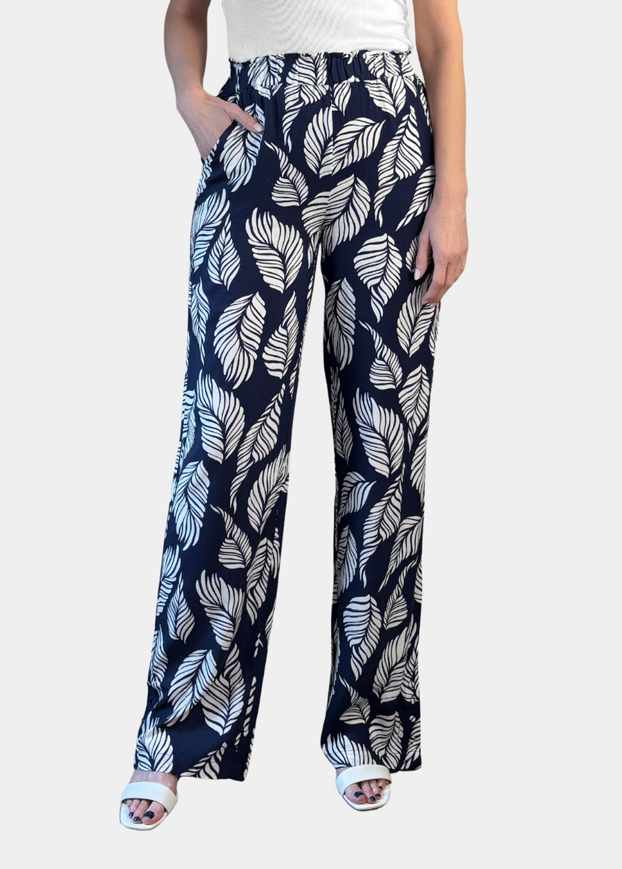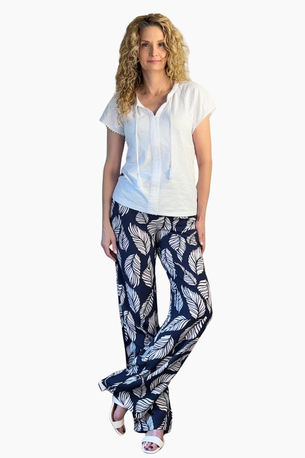 Ready for a vacation?? Our Palm Springs pant is ready. Chic and comfortable, the bold palm print, textured challis fabric and wide leg silhouette make this an easy summer go-to. Wide, pull on style waistband with a feminine ruffle detail and front pockets. The hem features functional side vents with covered buttons the can be worn closed or unbuttoned for a split hem look.