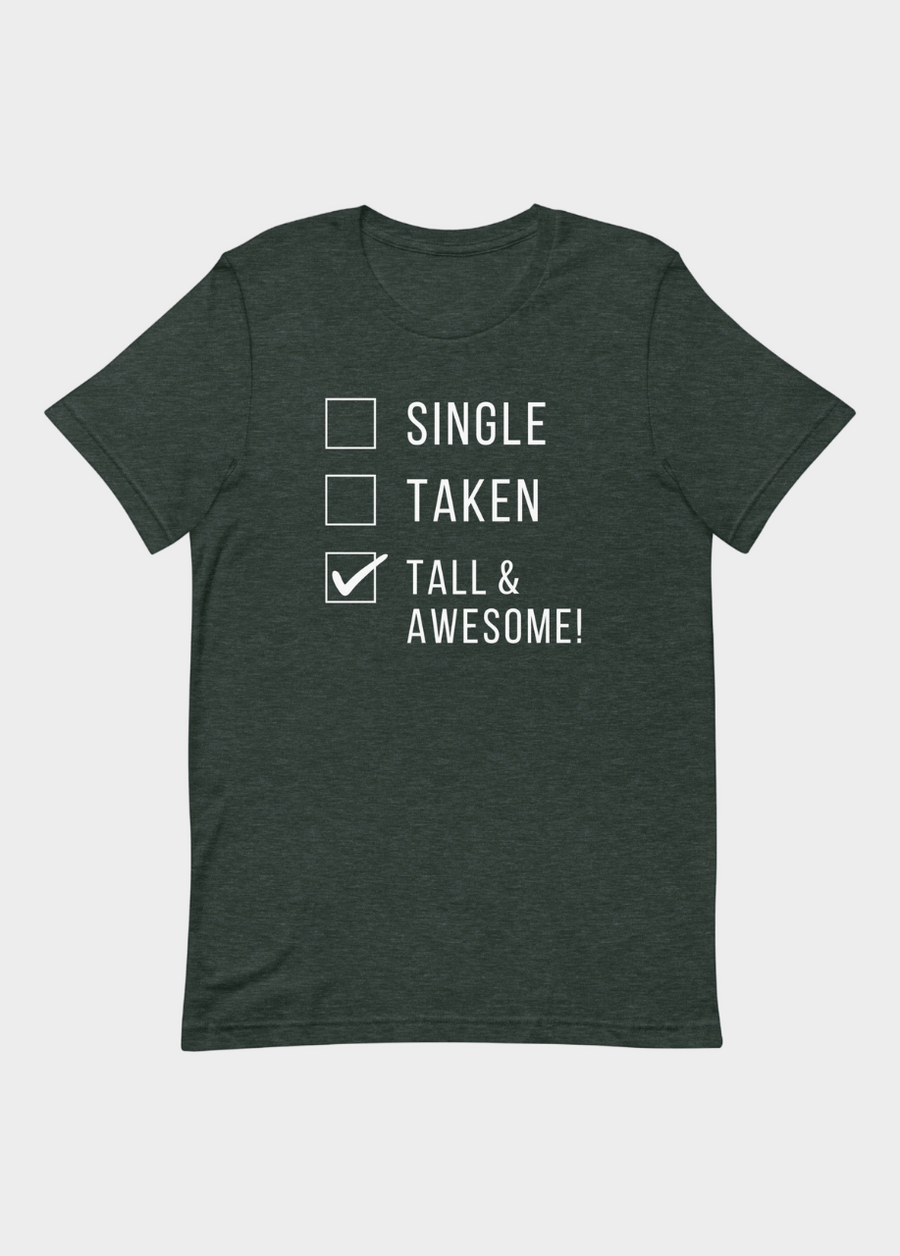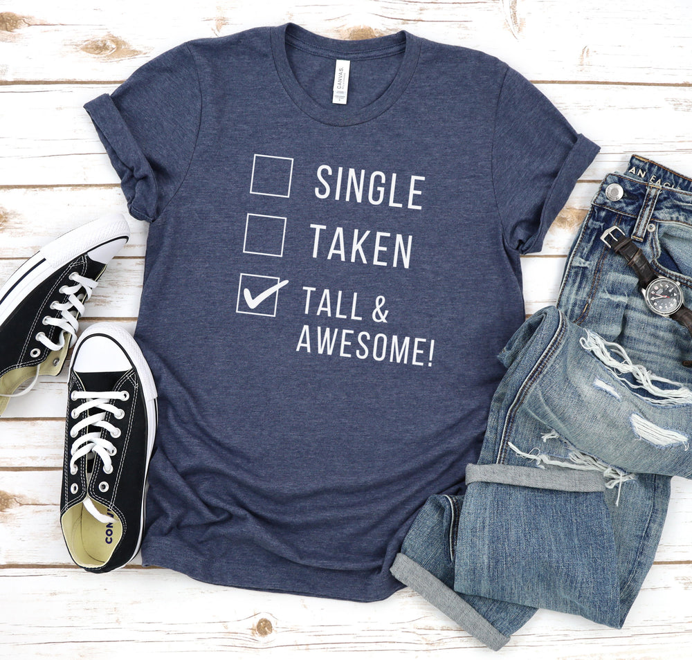 Whether you're single or whether you're already taken is not what's important for someone to know. The check mark is in the right box on this funny graphic t-shirt that tells the simple truth that you are TALL and AWESOME! Point made. Moving on.