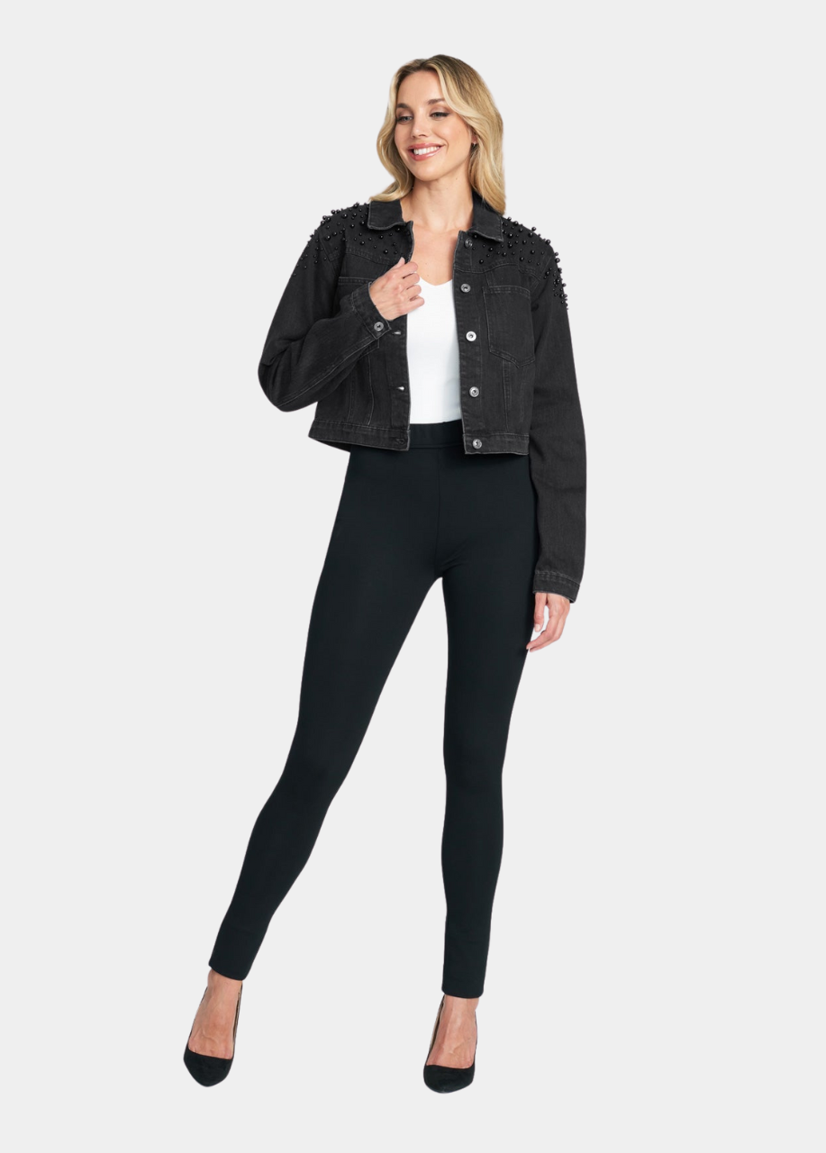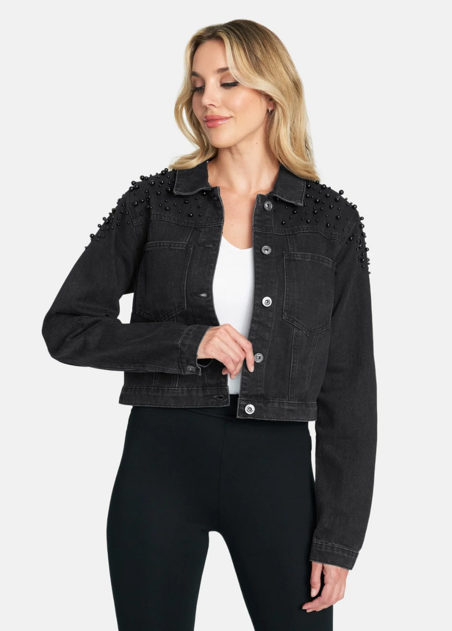 Gradient pearl embellishments breathe '80s glamour into this cropped denim jacket. Featuring two front pockets, this piece is a modern take on the basic jean jacket.