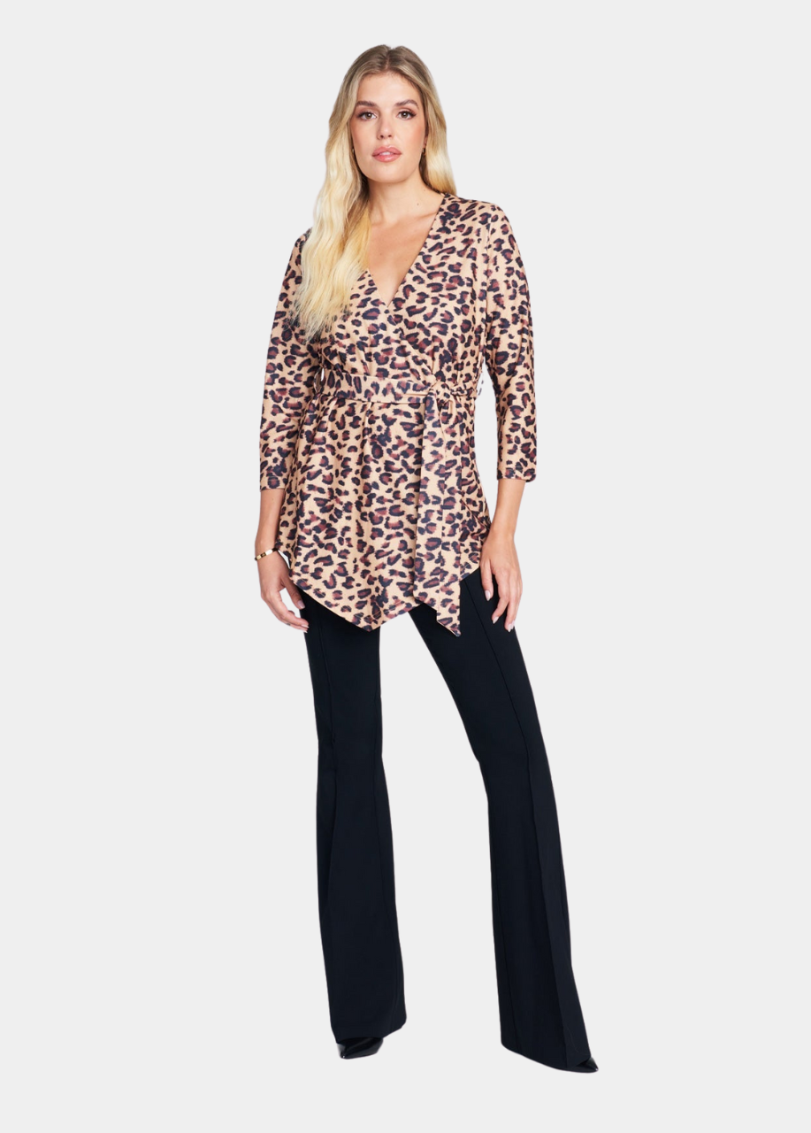 A classic wrap silhouette. The Courtney top features ¾ sleeves, animal print, and a conservative v-neckline. The perfect top to add some sass to your work wardrobe.