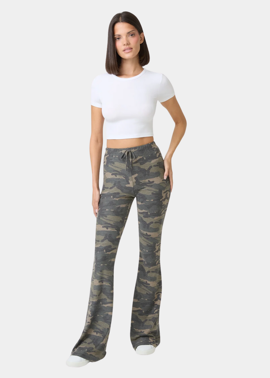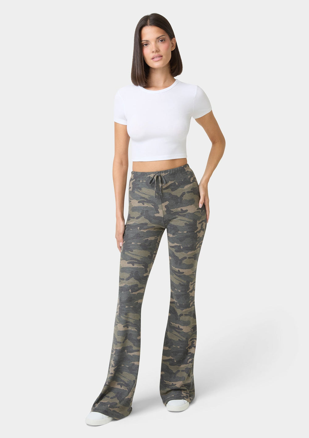 Lounge in style. Elana features a lightweight rib knit fabric, faux front tie and flare leg.