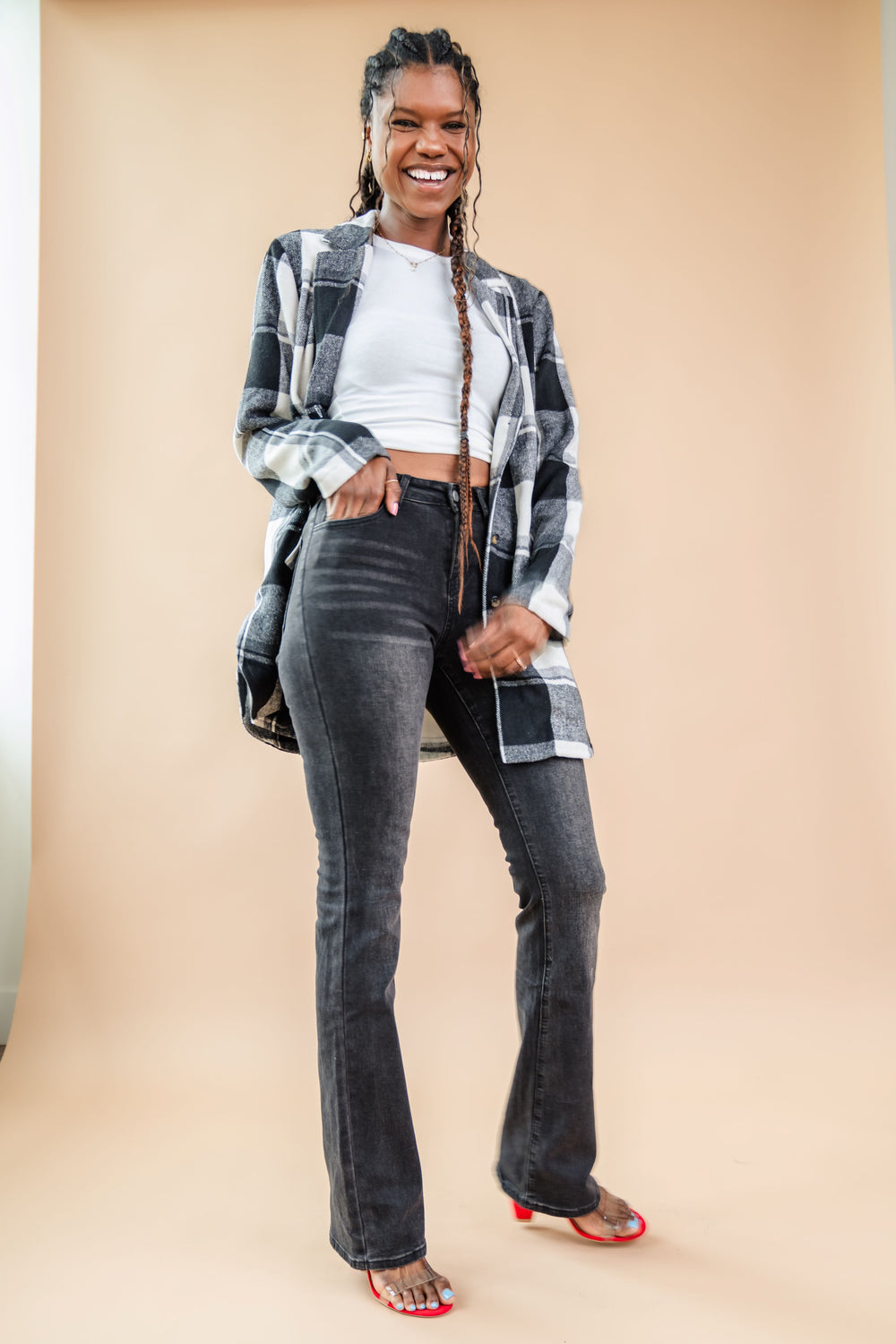 Elevate your denim collection with our Midnight Mist Bootcut Jeans! Featuring a chic dark grey wash, these jeans offer a modern twist on a classic style. The bootcut silhouette provides a flattering fit that elongates your legs, perfect for pairing with your favorite boots or heels.