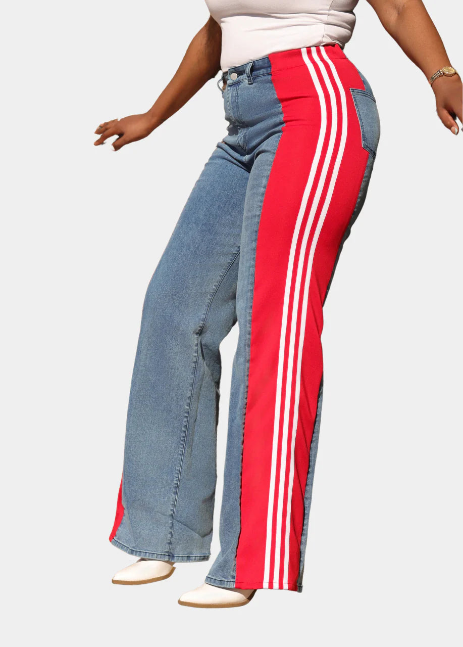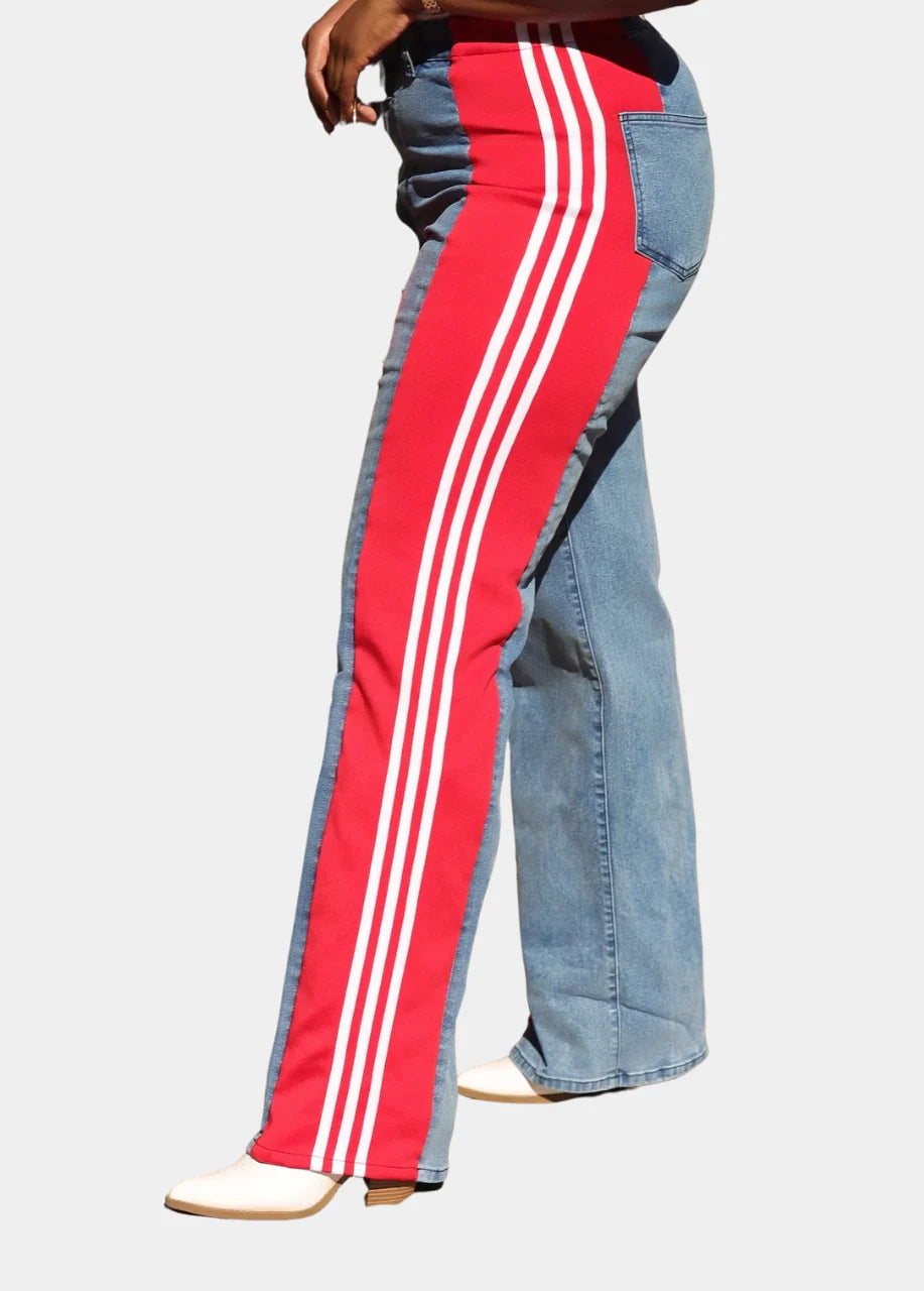 Designed for tall women who love bold, statement-making fashion, our Stride Length Jeans blend streetwear edge with everyday comfort. These high-waisted, wide-leg jeans feature a striking red side panel with classic white triple stripes, adding an athletic-chic touch to your denim collection.