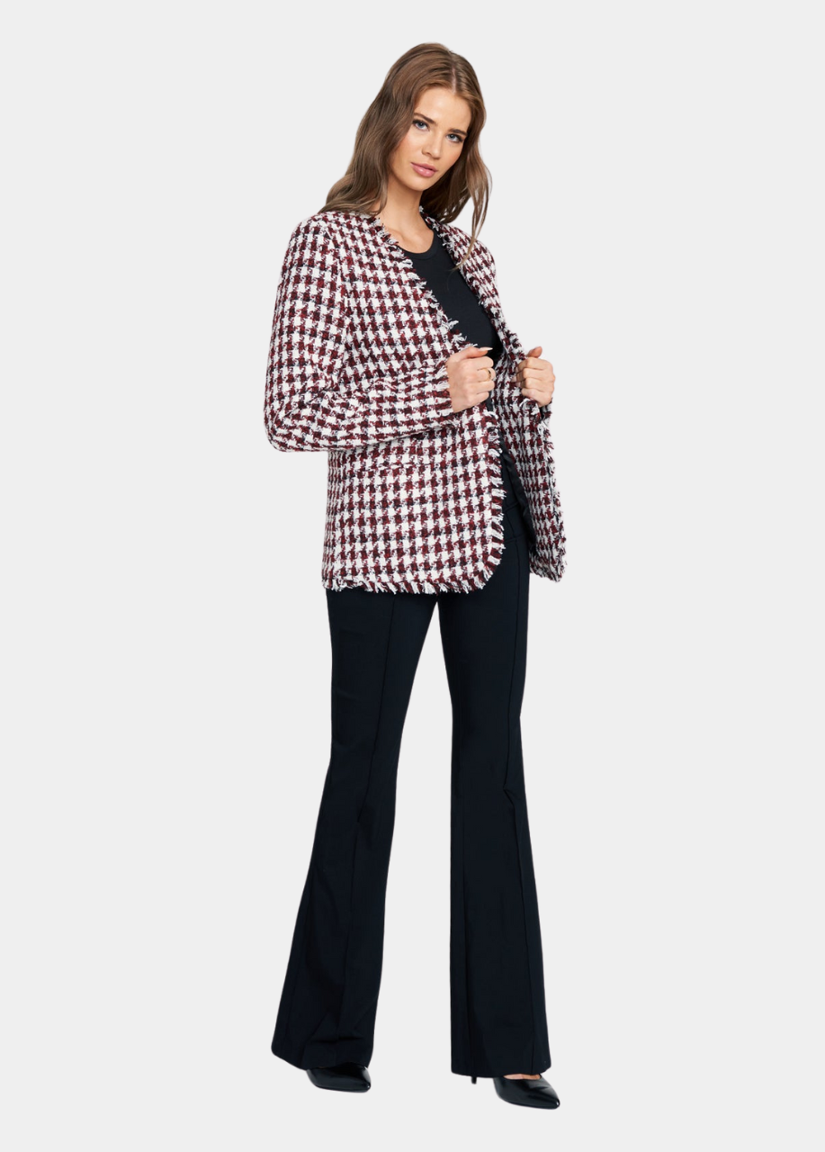 Fringed accents and a jazzy houndstooth animate this versatile blazer jacket tailored with faux front pockets, lining, and a single-button closure. The Robin jacket brings a contemporary feel to your traditional houndstooth jacket.