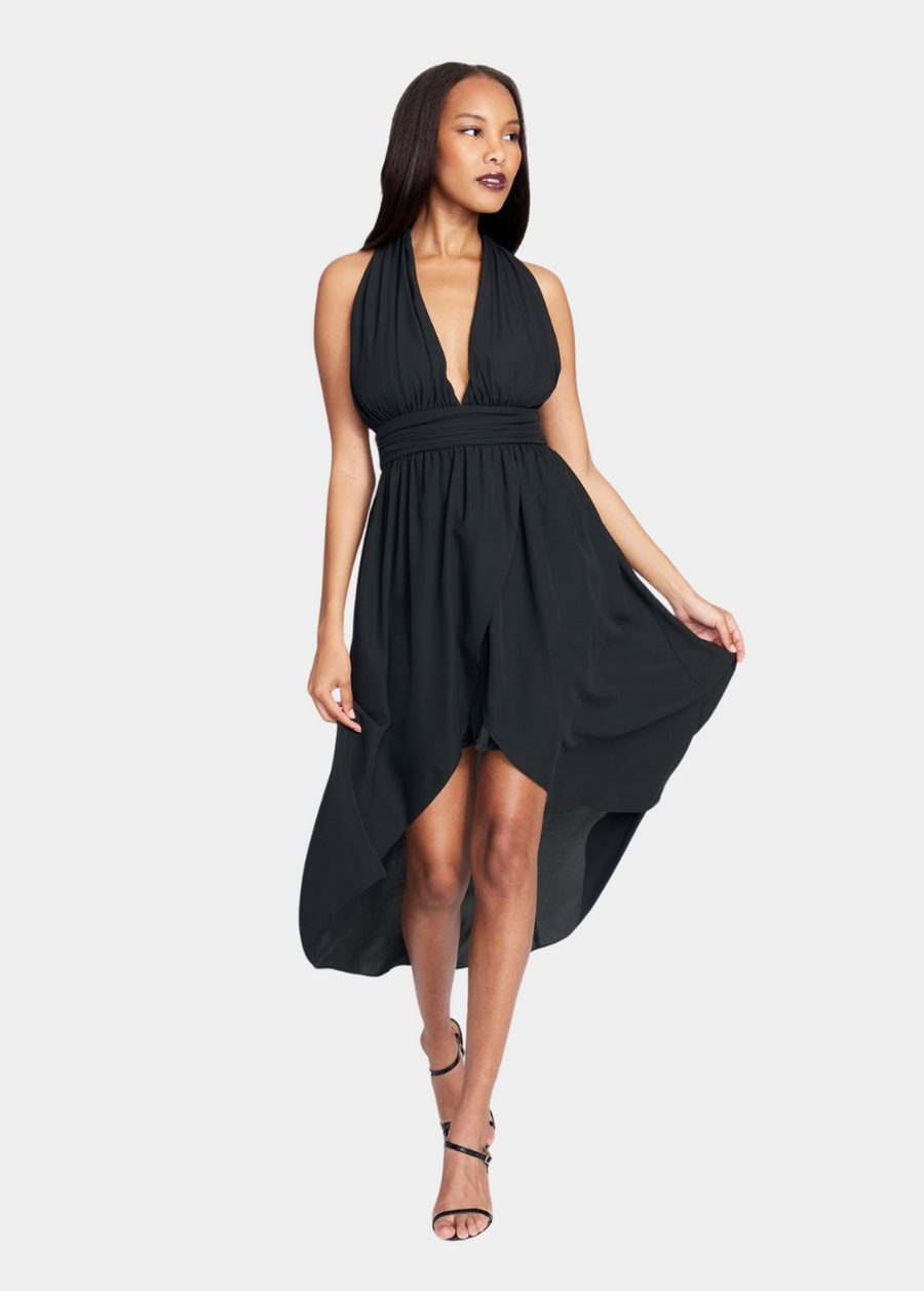 A beautifully draped chiffon dress evokes timeless glamour with a ruched bodice, flattering V-plunge neckline and a dramatic hi-low asymmetrical cut hem. The Shandra maxi dress features a twist back design flowing into a zipper closure. An easy & elegant dress for any occasion.