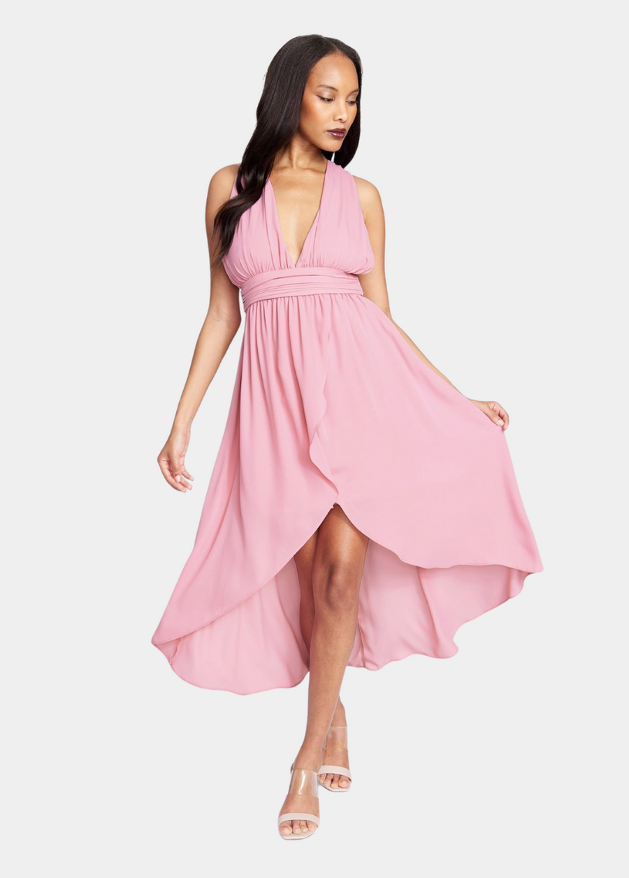 A beautifully draped chiffon dress evokes timeless glamour with a ruched bodice, flattering V-plunge neckline and a dramatic hi-low asymmetrical cut hem. The Shandra maxi dress features a twist back design flowing into a zipper closure. An easy & elegant dress for any occasion.