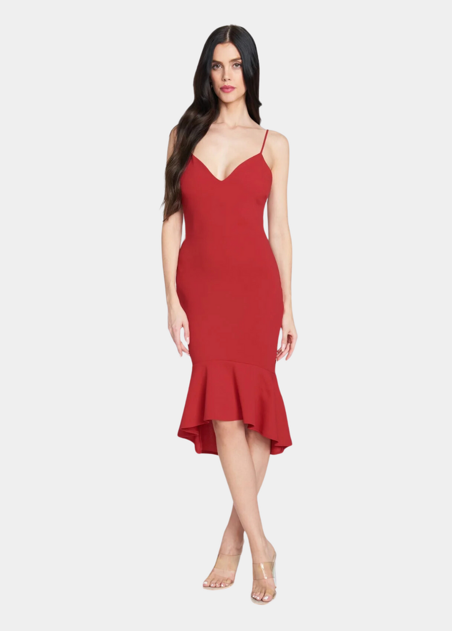 Have a little salsa moment with the Sophia midi dress! Featuring a v-cut neckline and a flared hi-low mermaid hem that balances the bodycon silhouette. Adjustable straps for added comfort.