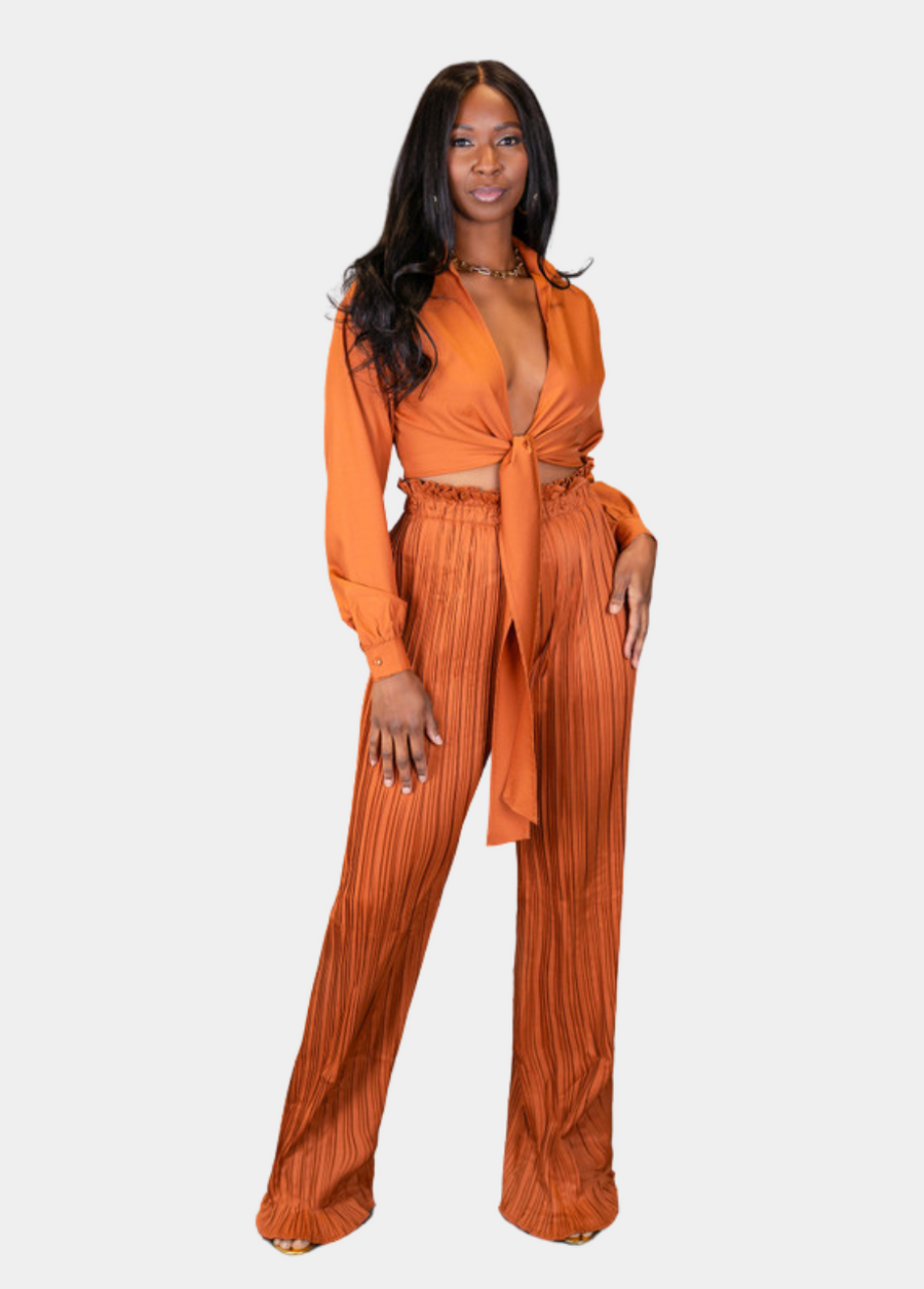Elevate your style with the Gianna Pleated Pant Set. This chic and stylish outfit features a tie front blouse and pleated pant that is perfect for special occasions or a night out. Make dressing up a no brainer with this one!