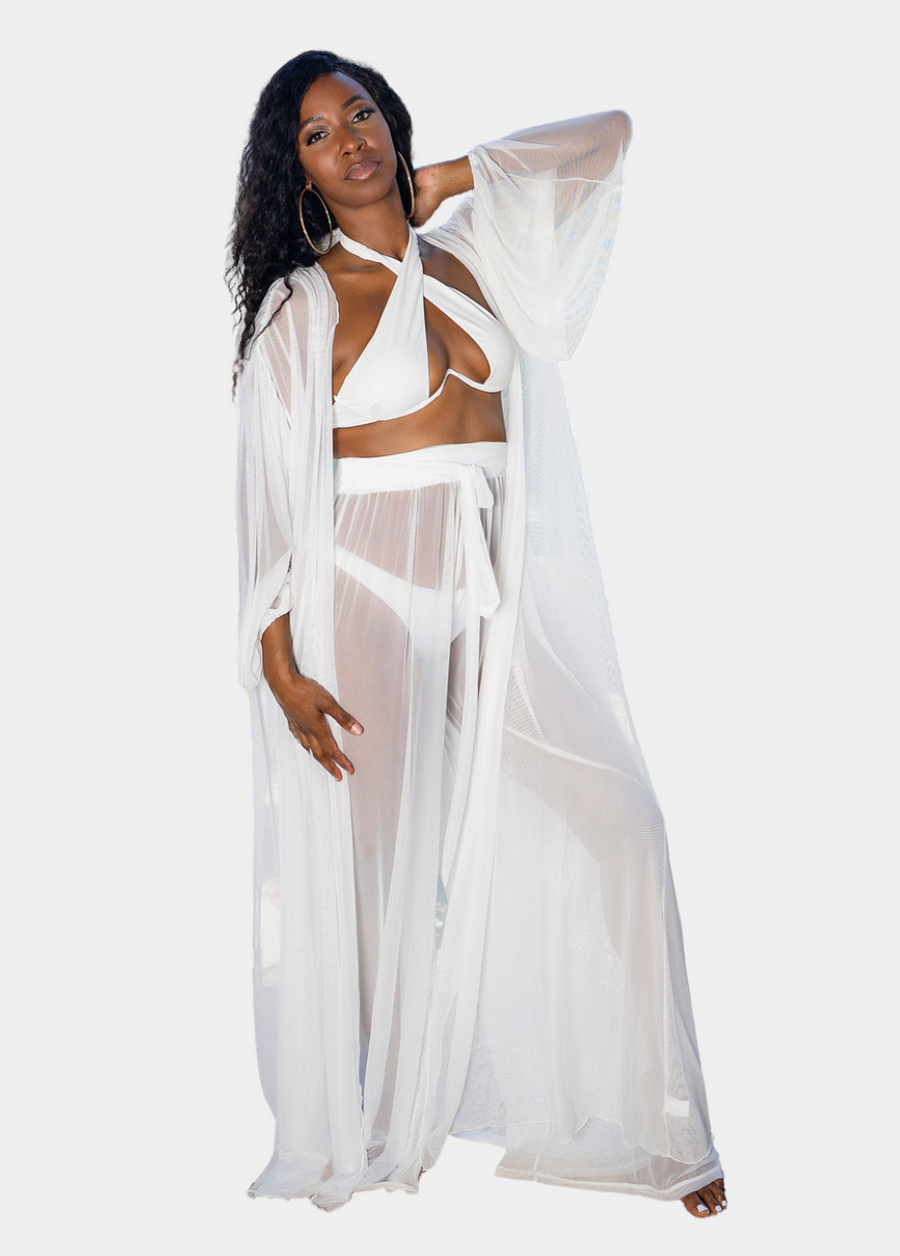 The Santorini Mesh Cover Up Set is where sexy and sophisticated beachwear meet. The wide leg pants offer a chic and comfortable fit, ensuring you stay stylish and relaxed, while the robe brings a flowing elegance to your look. Wear this look over your favorite swimsuit and enjoy a tropical day by the cabana.