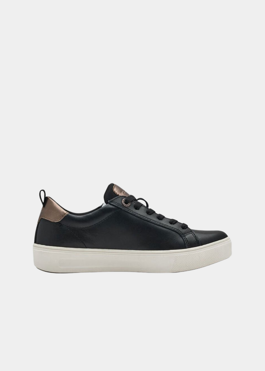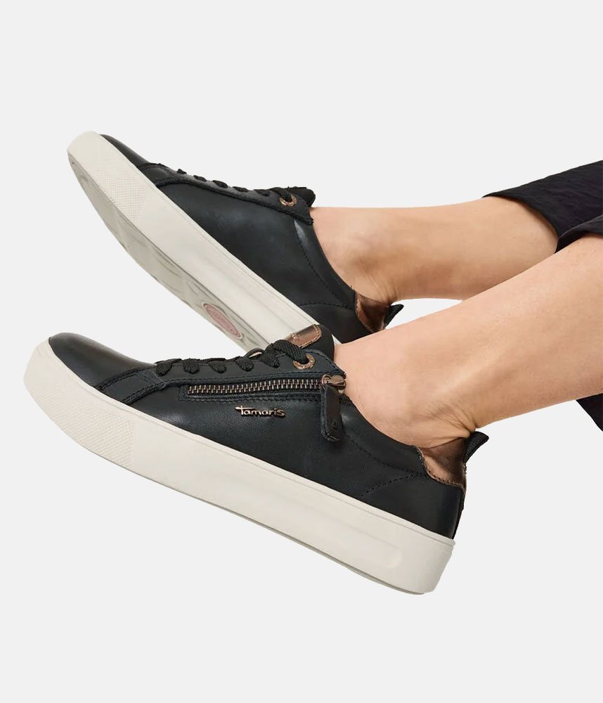 You will love this Tamaris women’s sneaker from their comfort collection in Black with Gold trim. This is a Fashionable Trainer but also is a Comfortable fit with superior cushioning. Featuring a handstitched Leather upper, removable insole and with lacing and zipper for easy on and off.