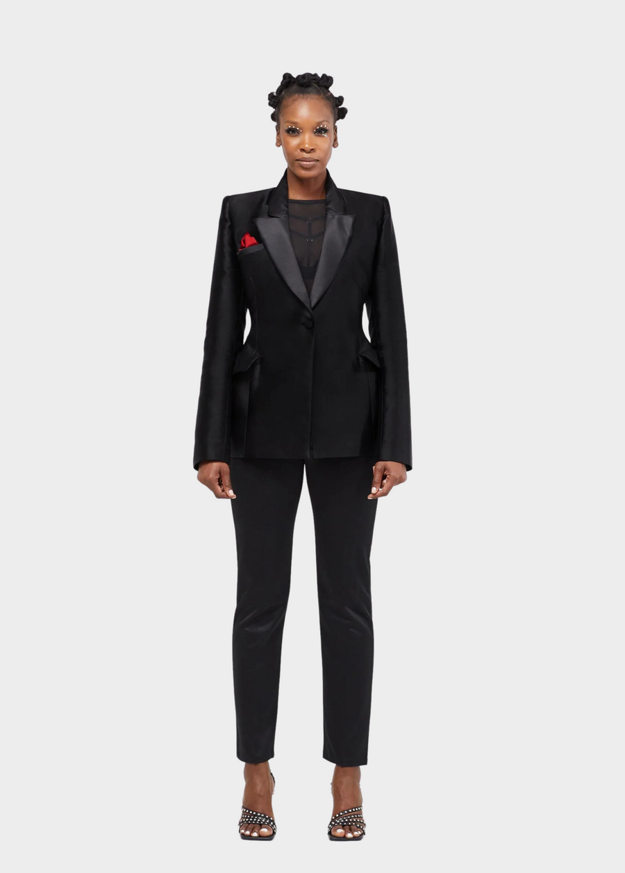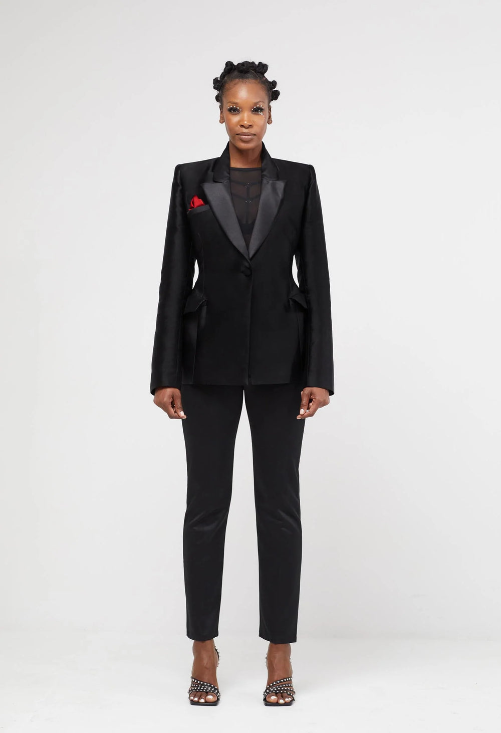 Take your style up a notch with The Camille Blazer. This structured single-breasted blazer is an effortless way to look pulled together. Its tailored silhouette features padding at the shoulders, notched lapels, and a contoured waist for an ultra-flattering hourglass shape. Long sleeves with button cuffs and front fastenings polish off the look. The matte black color easily matches everything and transitions seamlessly from day to night. Heading into an important meeting? Toss it on over a sheath dress to exude confidence and sophistication. Drinks after work? Just add some skinny jeans, heels, and you’re ready for happy hour with minimal effort. For the woman who wants to look expensive and elegant without the fuss, The Camille Blazer is a closet staple that will upgrade every outfit.