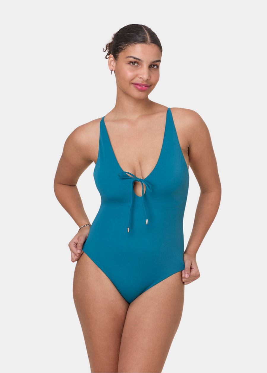 With a plunging V-neckline featuring keyhole tie detail, the Sicily one-piece is a timeless silhouette with a sexy feel. Adjustable straps, removable cups, and medium coverage allow for a customizable look and fit.