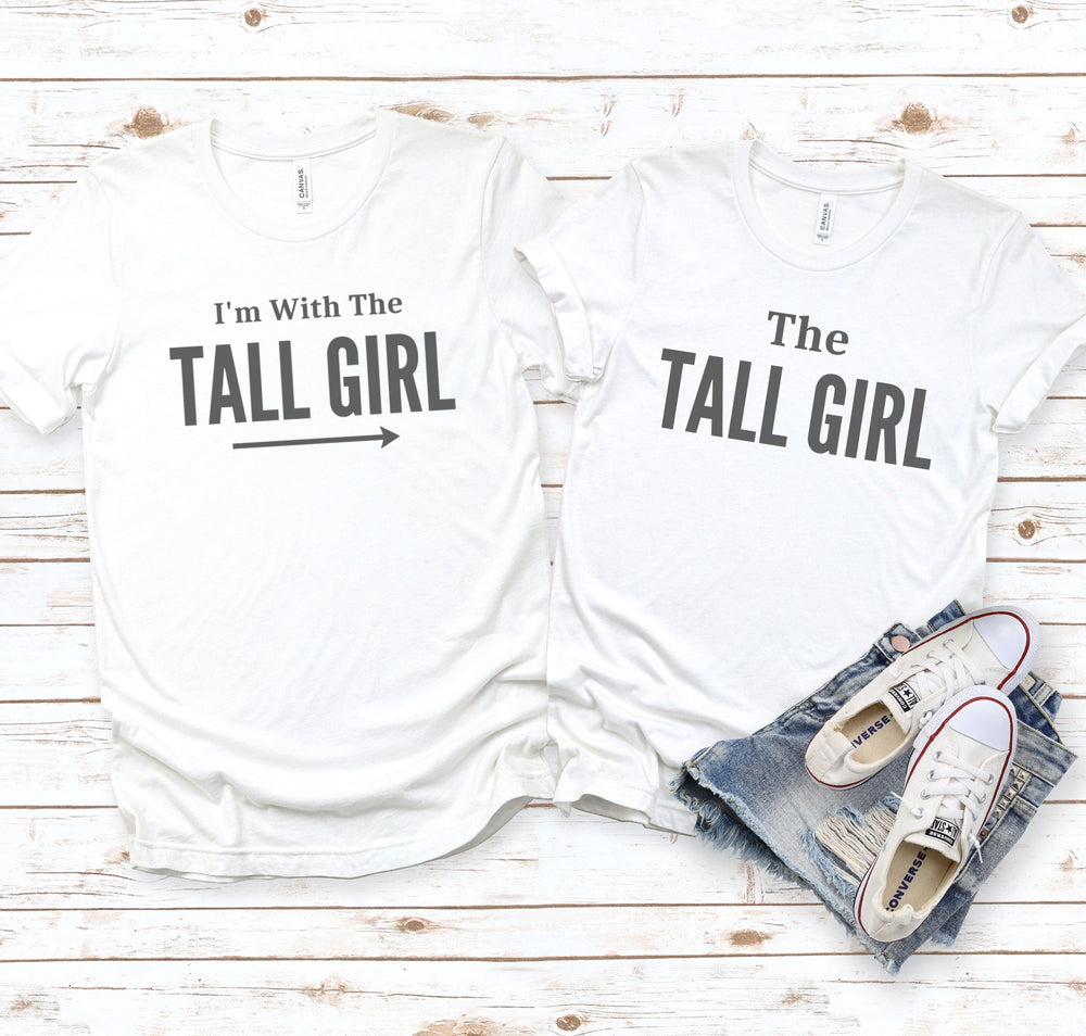 Tell the world who the perfect power couple is with our tall-related matching t-shirt designs. Get the matching "I'm With the Tall Girl" t-shirt.