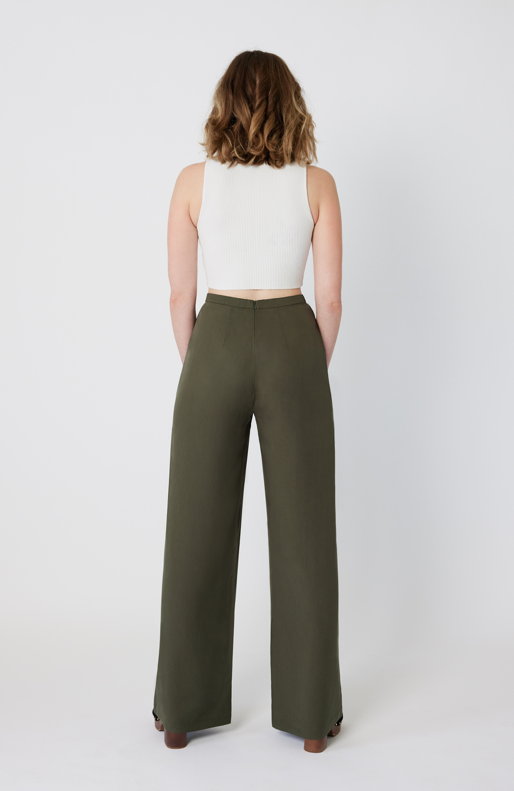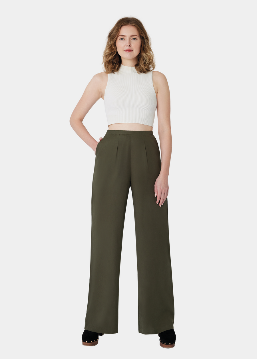 Our bestselling Wide Leg Pant is now available in a 34" inseam. Featuring the same waist-nipping rise, with a roomy fit through the hips and thighs. Made with a smooth TencelTM fabric that glides across the skin and deep, hidden inseam pockets that don’t puff.