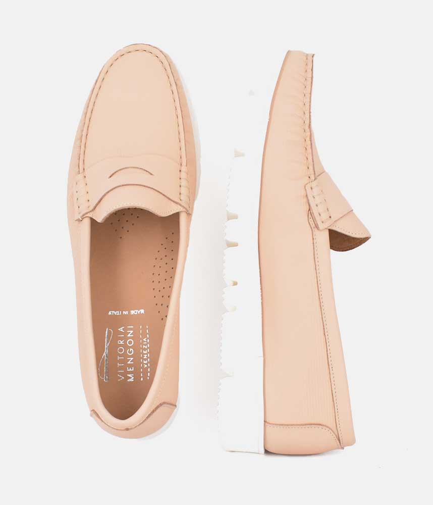 This style features a chunky white sole with a Beautifully Soft contrasting Beige Leather upper. These loafers by VITTORIA MENGONI are exquisitely handmade by Italian Craftsman, using only top quality Italian leathers. Super comfortable to wear, with their super soft leather and padded insole which ensure all day comfort.