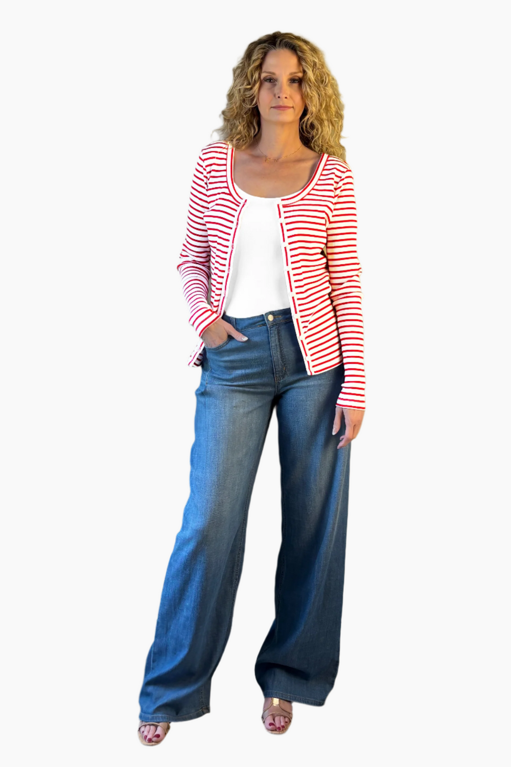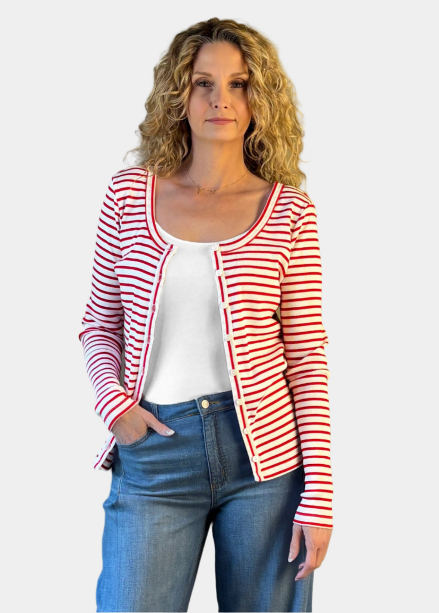 Plus, who doesn't love stripes? The baby rib fabric is made of 100% yarn dyed cotton and stretches for all day comfort. Pair it with your favorite jeans or shorts for a effortless and chic look. Shown styles with our Audrey Coastline jean.