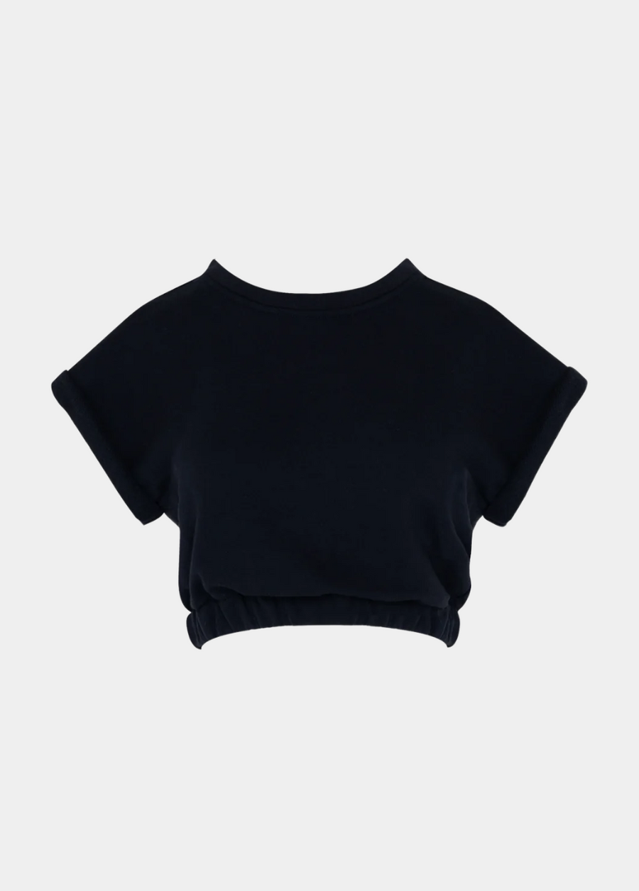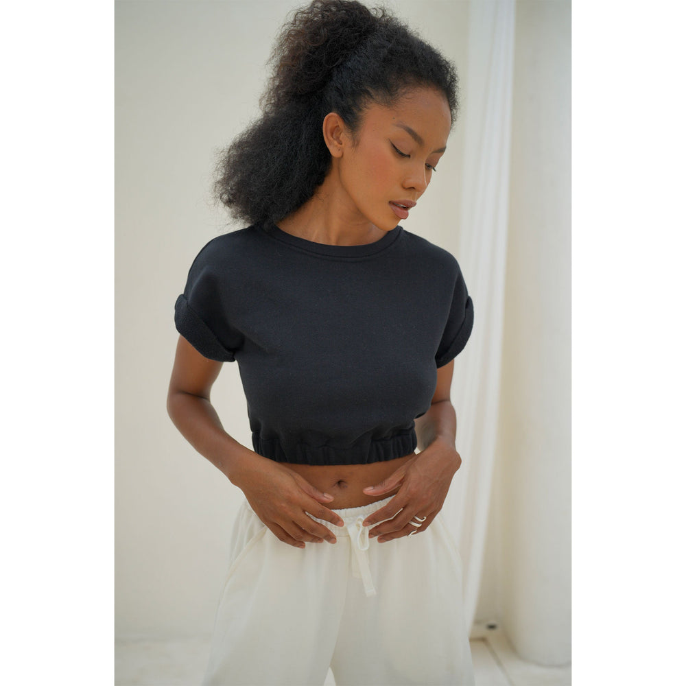 This chic top features a folded sleeve hem and an elasticated waist, offering a flattering fit that pairs effortlessly with any wardrobe. Made from soft organic French Terry fabric, it ensures all-day comfort while the versatile Black color adds sophistication.