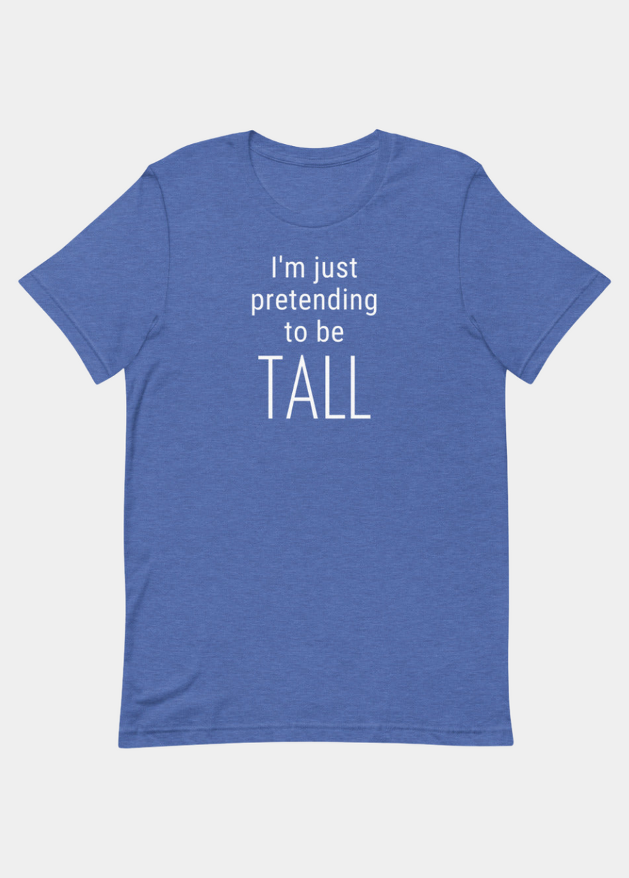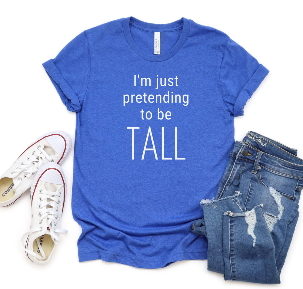 You may look tall to others, but really you're just pretending, right? With the phrase "I'm just pretending to be TALL" front and center, this funny and clever text-based design is sure to get you some laughs as the strangers look your way!