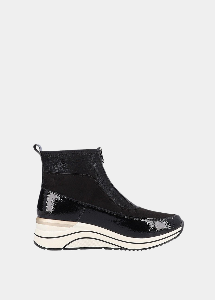A Super comfortable and stylish ankle boot rocking that sock boot vibe with the feel of a trainer from Remonte. Featuring a combination upper in mix of black patent, suedette and a scuba like textile to the vamp and collar. The scuba textile collar has an elasticated fit which hugs the skin like a sock and is fastened by a zip down the middle. Finished with a wedge heel for added height without losing on comfort. Complete with a soft lining with a cushioned Remonte Soft removable insole.