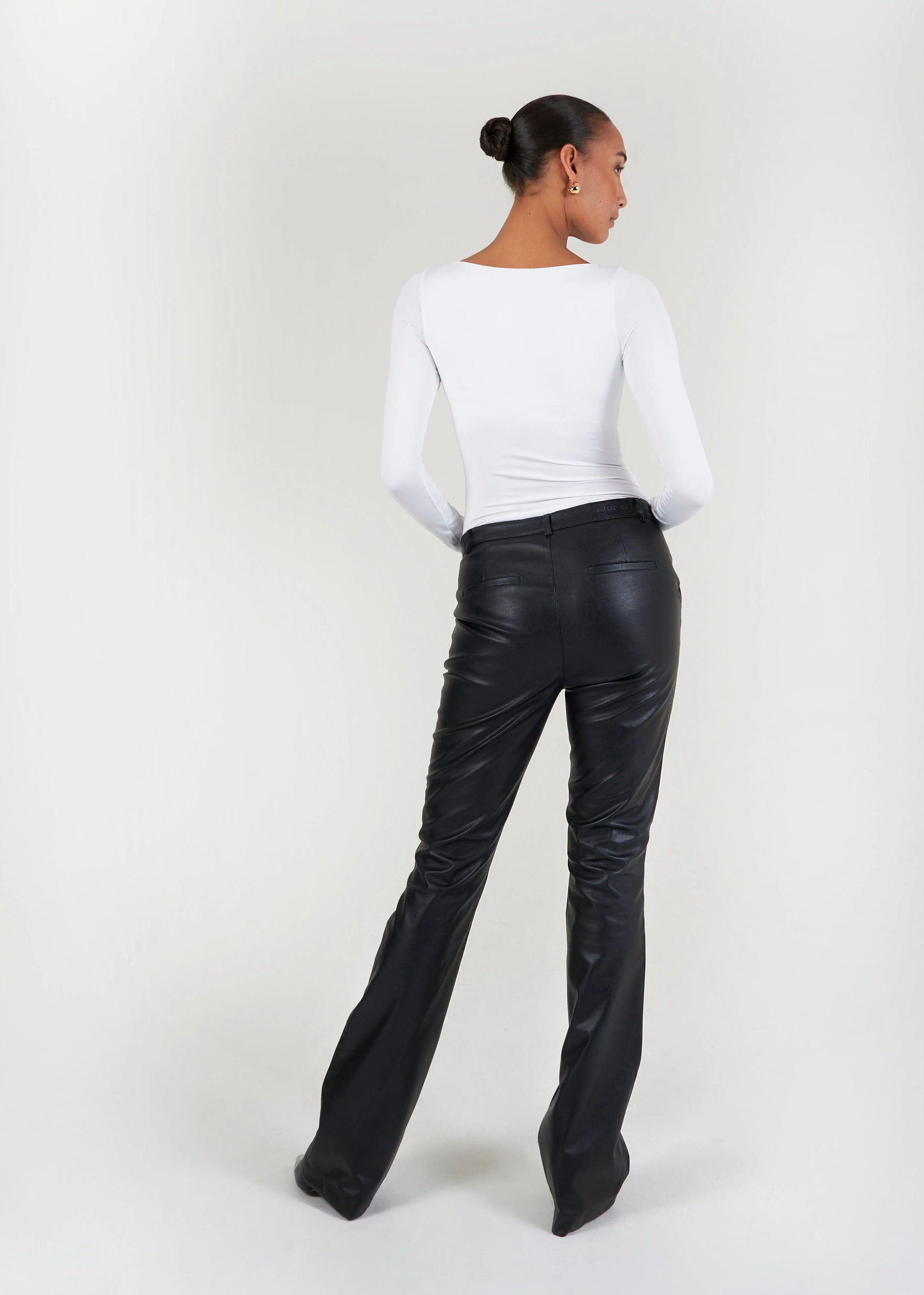 Please click on the size chart for your correct size! Beautiful Arshea is wearing our Vegan Leather Tall Pants Stephy in black, crafted from tea waste. Stephy is the perfect choice for tall women seeking quality and style. Made in Europe, this soft, flexible, and breathable fabric ensures all-day comfort. With meticulous attention to detail, these durable T FOR ALL bootcut pants offer a stylish, eco-friendly option that lets you contribute to a sustainable future without compromising on elegance.
