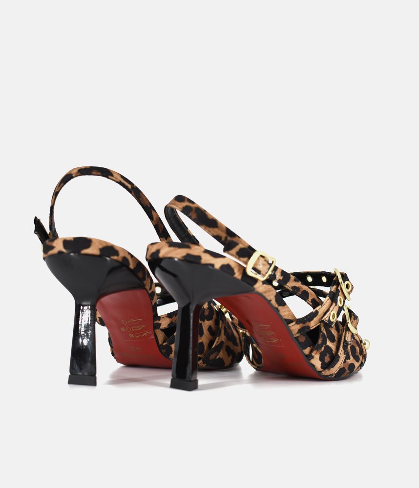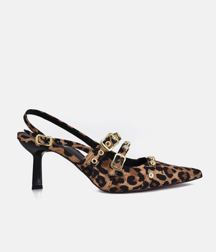 Unleash your wild side with these fiercely chic leopard print heels! Designed for the woman who commands attention, these stunning slingbacks feature a captivating print, bold gold buckles, and edgy stud detailing that will instantly elevate any outfit. The sleek pointed toe and comfortable mid-heel ensure you'll stride with confidence and style, from day to night. Get ready to turn heads and feel empowered!