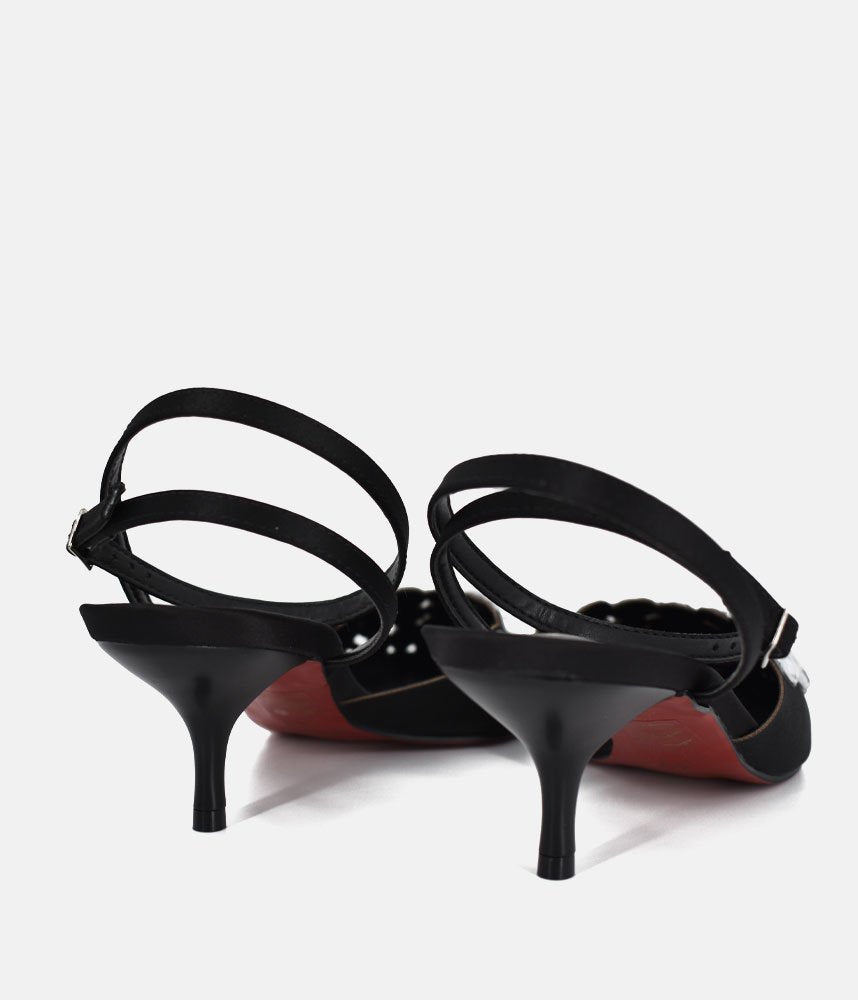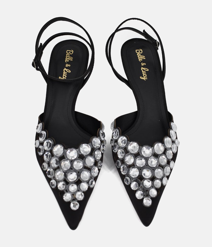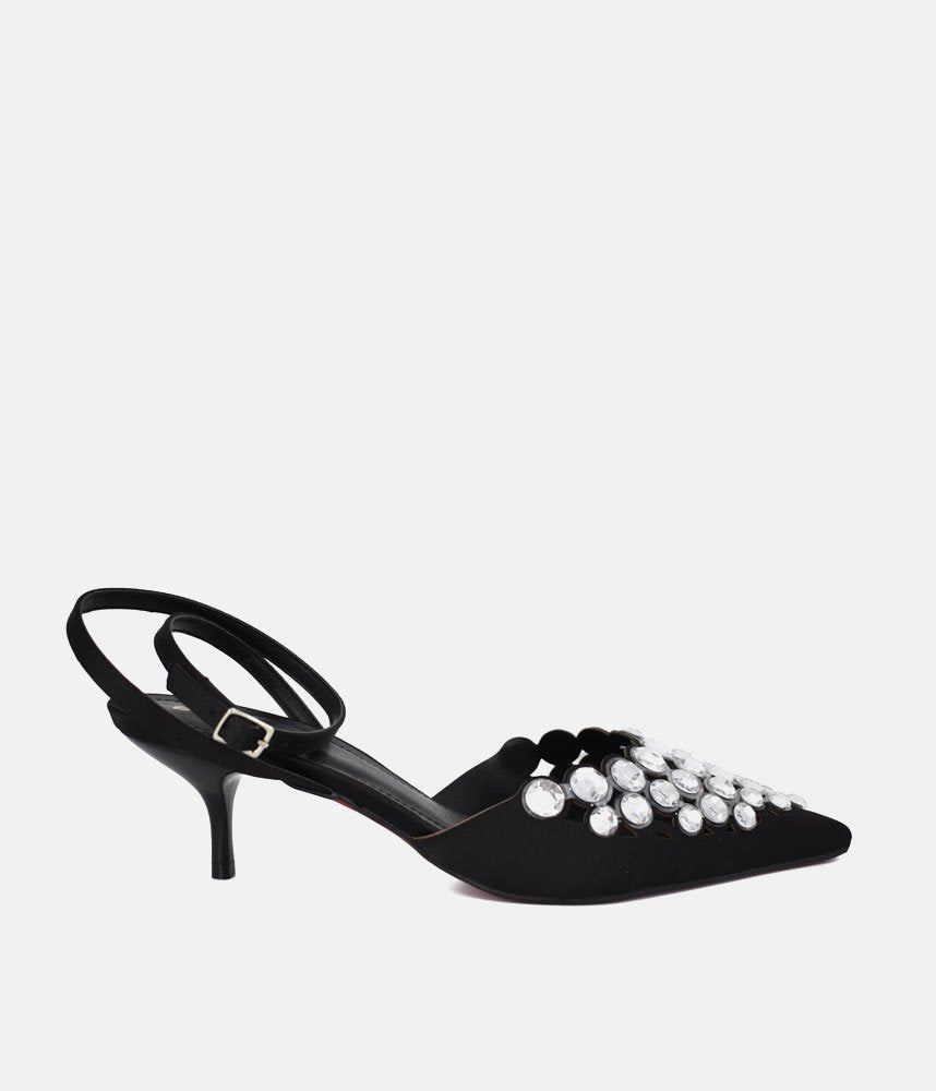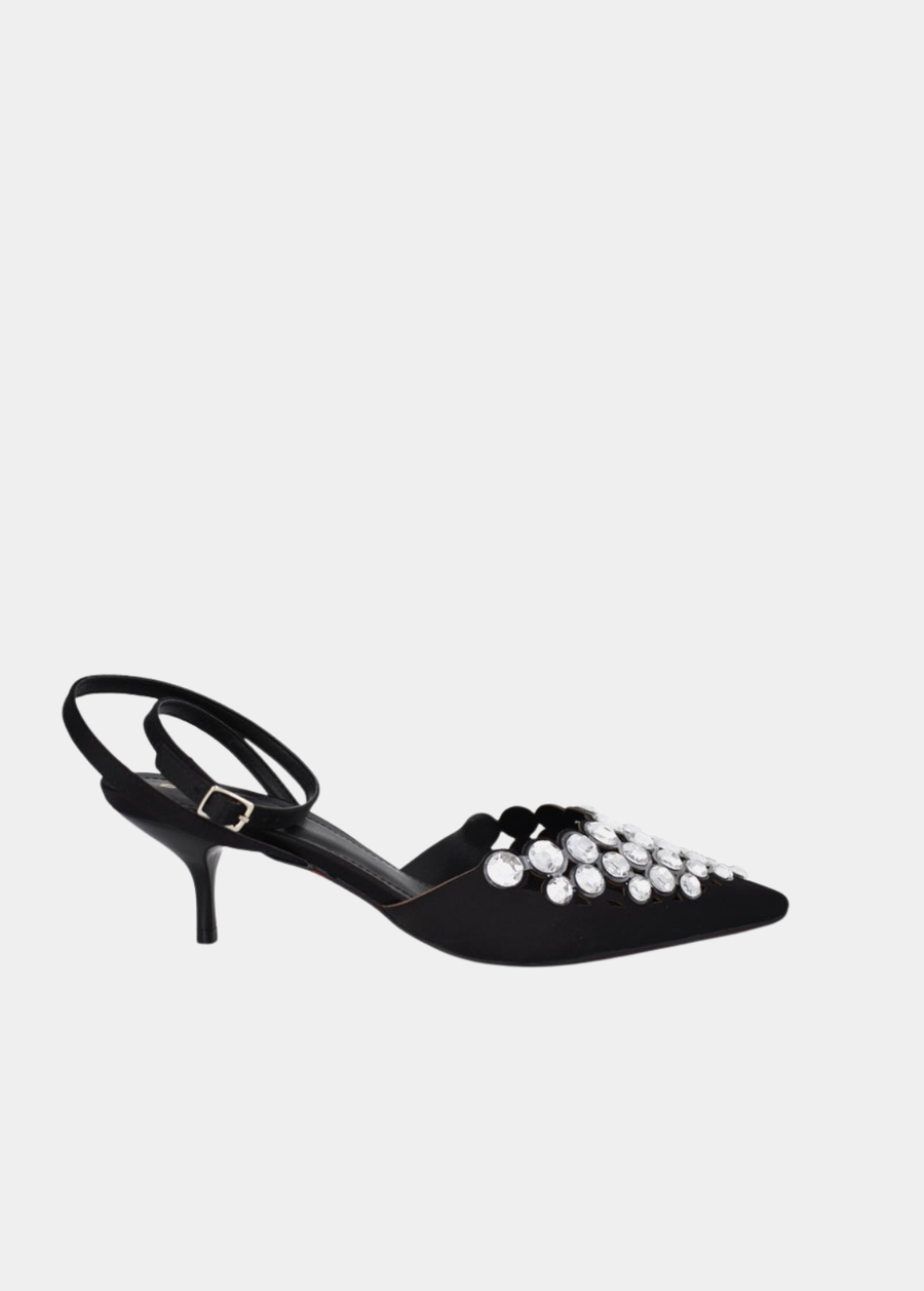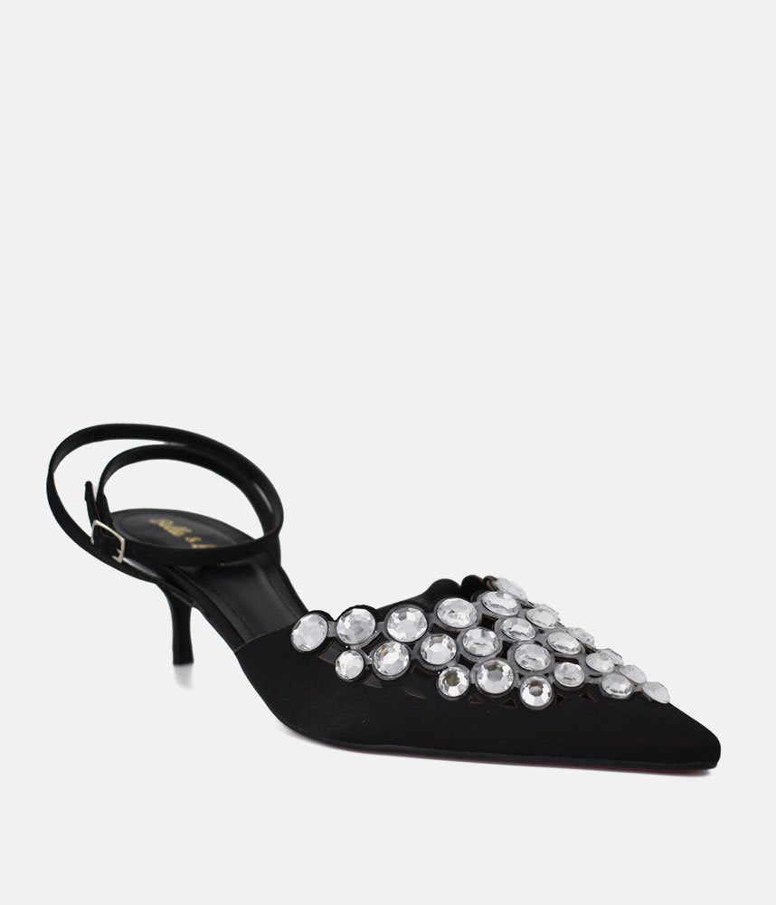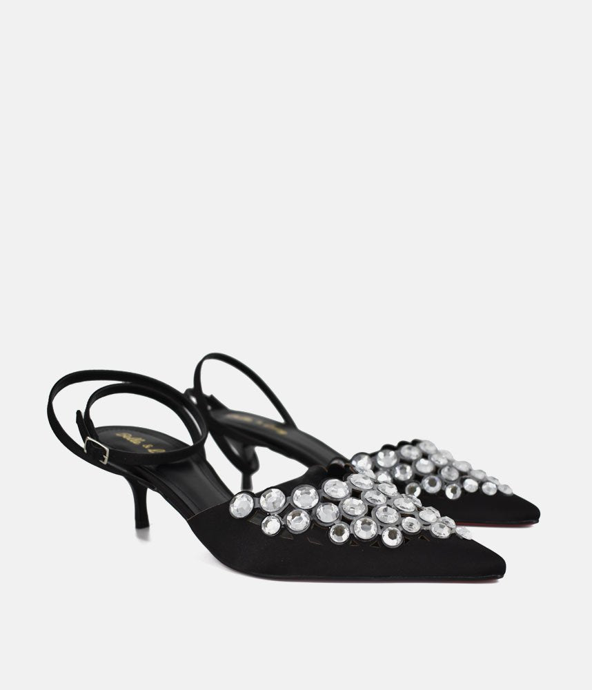 Step out in sophisticated style with these 2 inch black ankle strap heels. Crafted from luxurious black satin, they feature a delicate ankle strap for a secure and flattering fit. The focal point is the stunning embellishment of sparkling crystal circles on the front, adding a touch of glamour that will catch the light with every step. Adding a bold, fashionable touch, the distinctive red sole provides a pop of unexpected color, ensuring these heels are as unique as you are. Perfect for evening events or adding a chic touch to any outfit.
