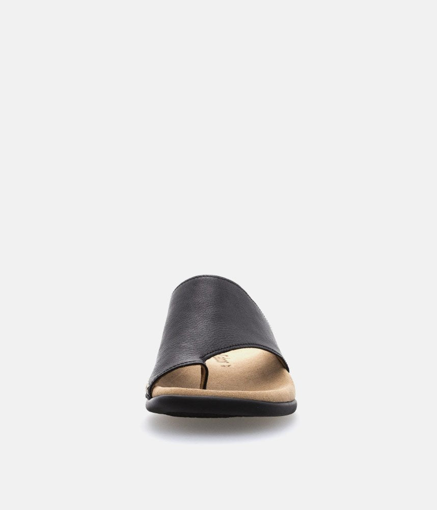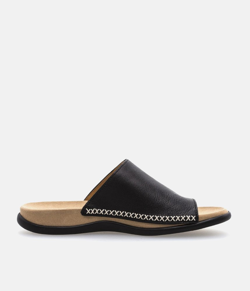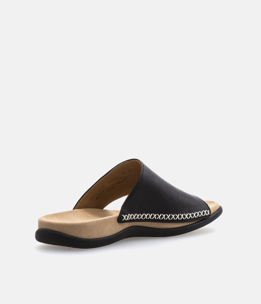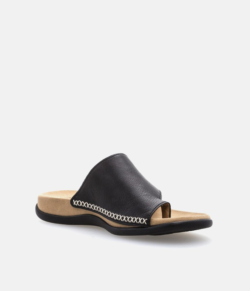 A stylish mule sandal in a simple but strong design. The leather upper wraps across the front of your foot, forming a toe post. The upper is stitched with large cross-hatch stitches directly to the foot bed of the sandal, making for a durable, flexible and comfortable construction. With open heel and toes, these sandals are easy to slip on and off and will keep your feet cool and comfortable. Featuring Gabor’s Best Fitting technology whereby the foot bed is broadened by 4mm across the joint area so that there is more surface area beneath the ball of your foot.