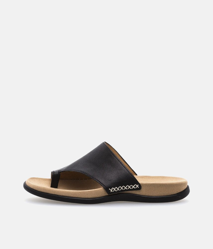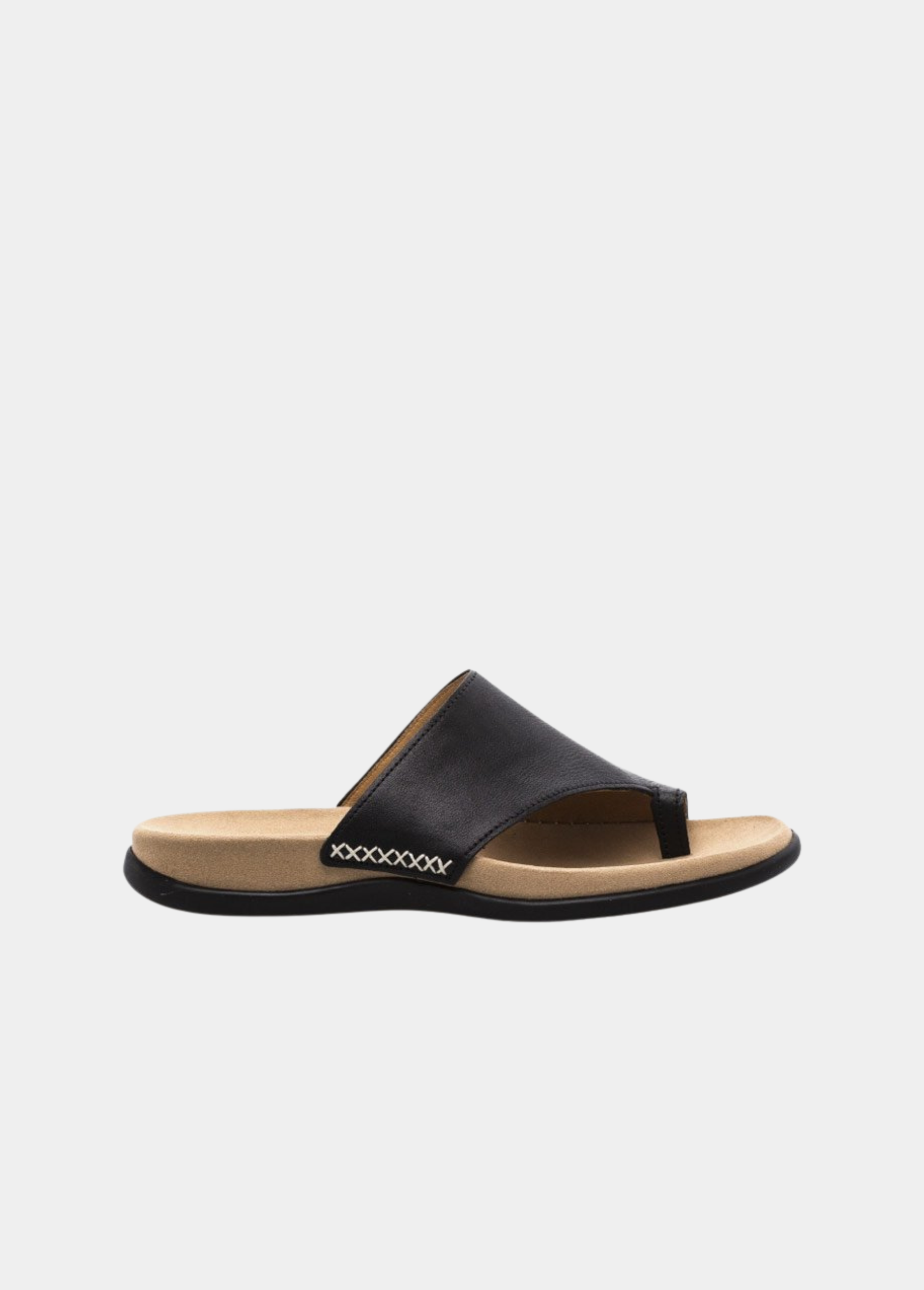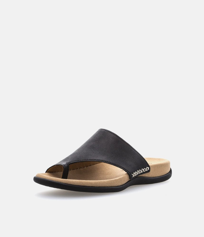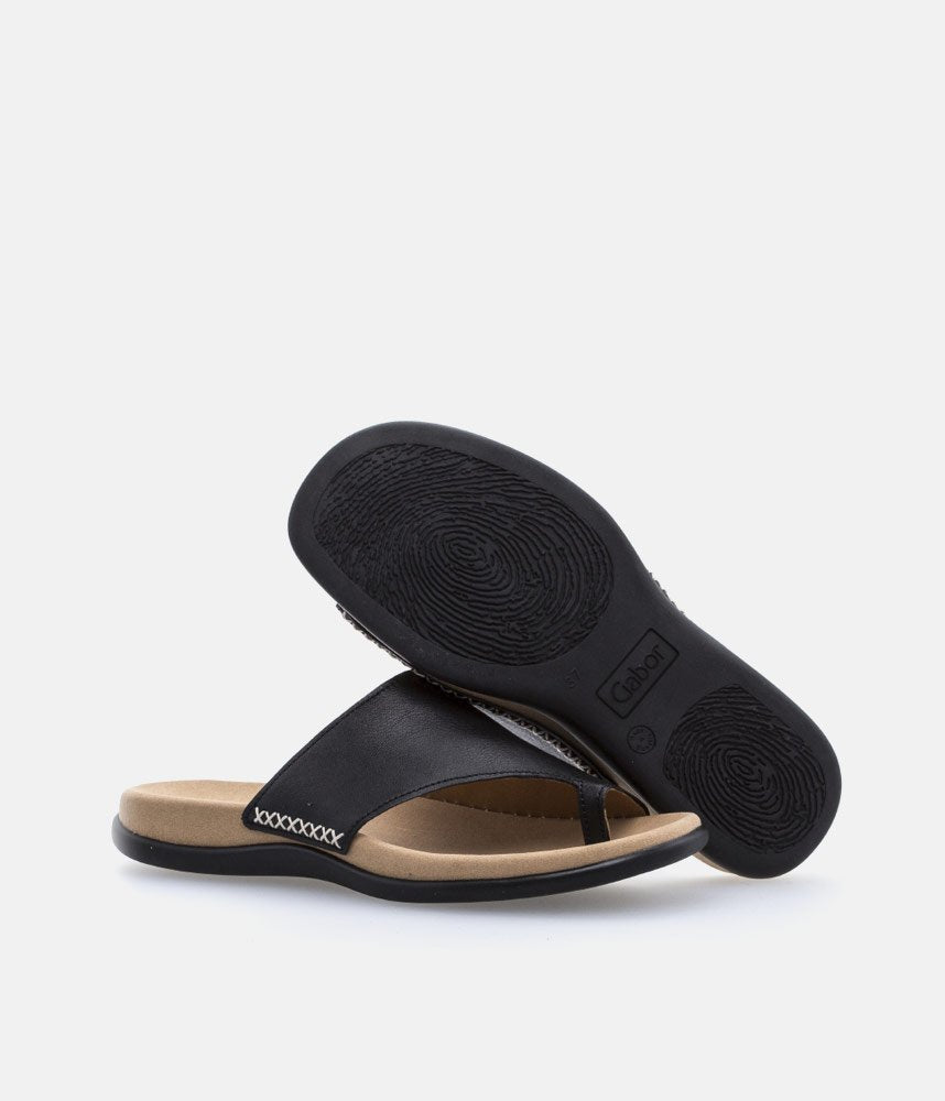 A stylish mule sandal in a simple but strong design. The leather upper wraps across the front of your foot, forming a toe post. The upper is stitched with large cross-hatch stitches directly to the foot bed of the sandal, making for a durable, flexible and comfortable construction. With open heel and toes, these sandals are easy to slip on and off and will keep your feet cool and comfortable. Featuring Gabor’s Best Fitting technology whereby the foot bed is broadened by 4mm across the joint area so that there is more surface area beneath the ball of your foot.
