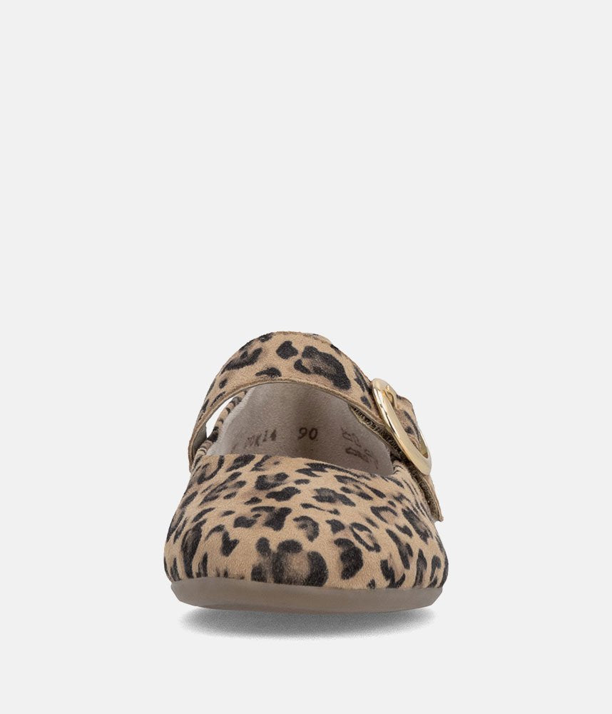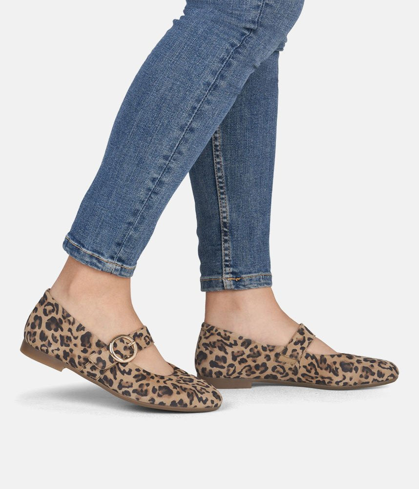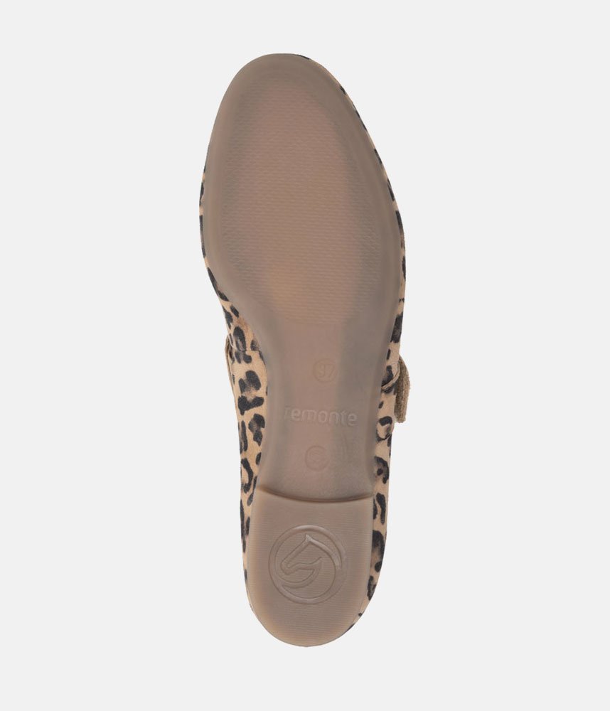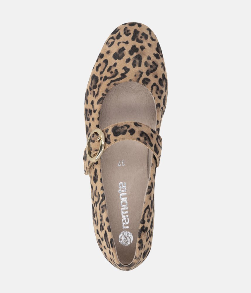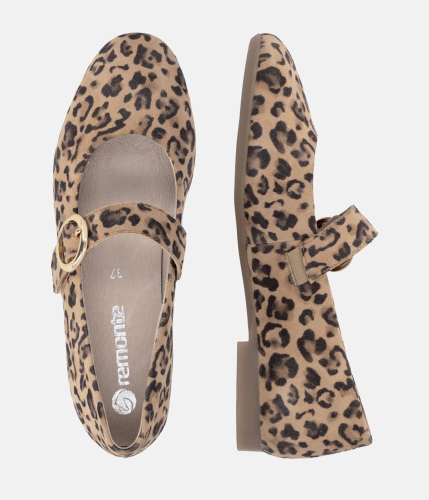 This is a Chic & Comfortable new model from Remonte with its modern take on the classic Mary Jane, featuring a comfortable flat profile and a rounded toe. Adorned with a striking, oversized gold-tone circular buckle on the instep strap for a touch of luxury. Crafted in a high-quality leopard print suede that adds texture and personality to any neutral outfit. These are the perfect statement shoe; pair them with cropped trousers or a simple black dress to let the print shine.